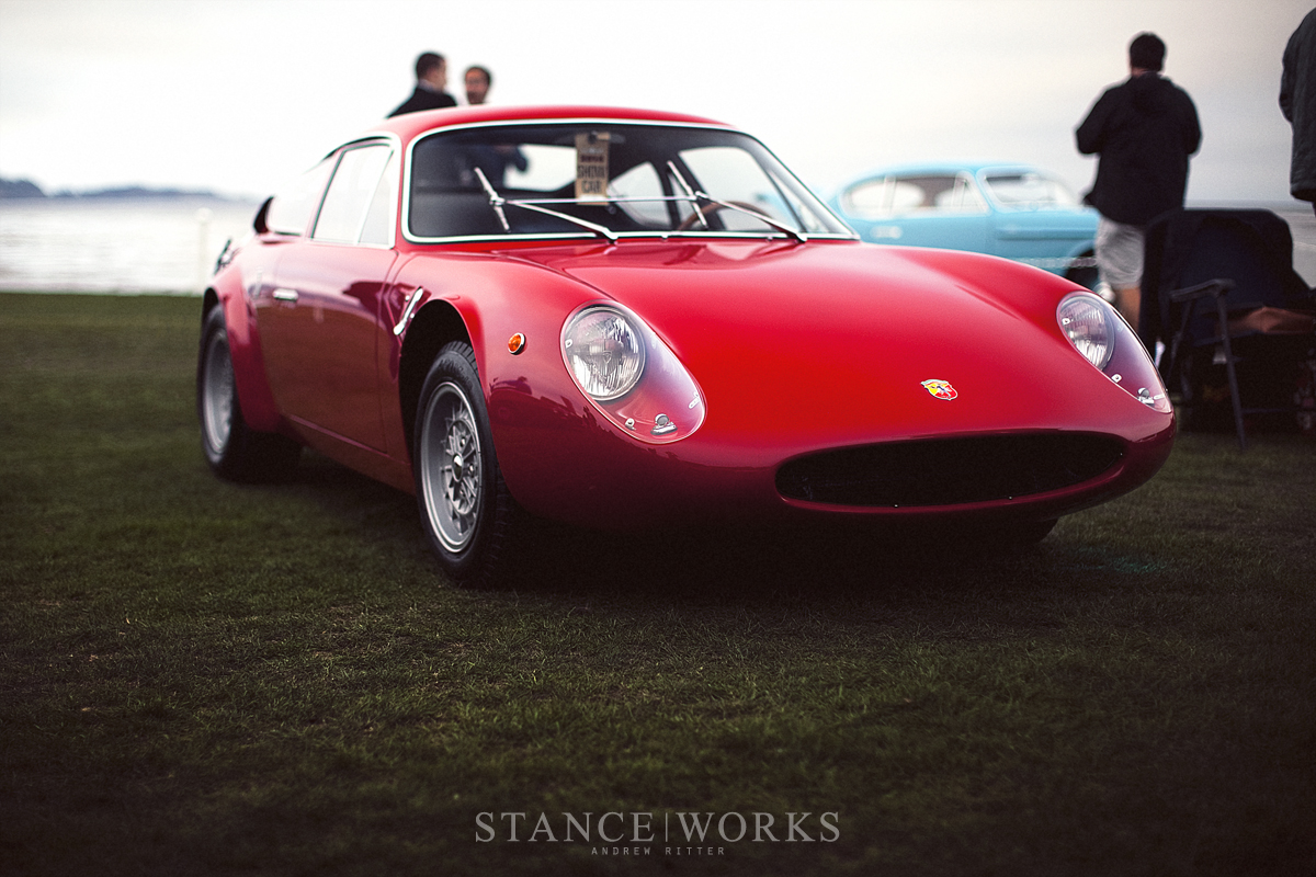 Les Burd's Abarth Simca 2000 GT, restored over seven years, stands out with its sloping windshield and extended nose. This rare Longnose Coupe, finished in vibrant red, features a rear-mounted 1946.27 cc engine, exuding nimble strength amidst its lightweight aluminum body.