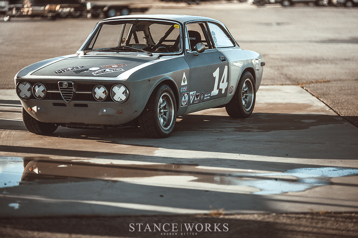 Chris Gonyea's 1971 Alfa Romeo 1750 GTV embraces a raw aesthetic, covered in primer and epoxy for a unique, rugged charm. Built with a focus on performance, it features a 2-liter engine swap with Italian 45 Webers and a Magnaflow exhaust. The GTV’s purposeful stance is accentuated by 14” Panasports and Koni Red shocks, balancing street and track capabilities.