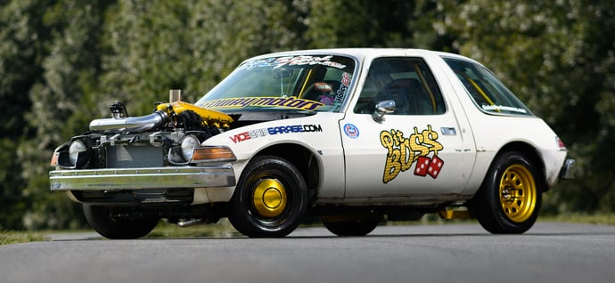 This 1976 AMC Pacer has been transformed into a burnout machine boasting an impressive 800 horsepower, thanks to a turbocharged LS V8 engine. Built by Brian Hensley, the car features a fortified LS engine with new pistons, forged connecting rods, and a BTR Stage 2 turbo camshaft, managed by a Holley Terminator X Max EFI system. The power is channeled through a billet TH400 automatic transmission with a trans brake, sending the grunt to the ground through a Ford 9-inch rear end. The Pacer retains a stock appearance, adorned with 'Pit Boss' graphics and gold-themed details, designed to capture attention in the burnout pit. A full roll cage and RaceQuip seats with harnesses complete the stripped-down, purpose-built interior.