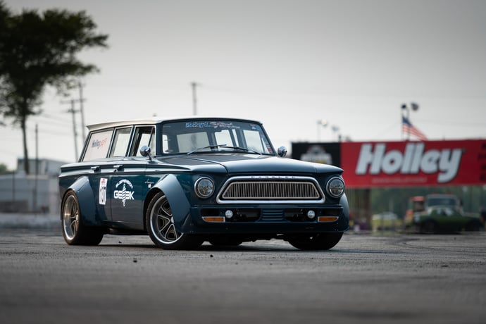 Suzy Bauter's 1963 Rambler American 220 station wagon features an LM7 5.3L V8 engine swap, paired with a 700R4 automatic transmission. Built for autocross, it sports a first-generation GM F-body front subframe, Global West upper A-Arms, and Viking Berzerker active suspension coil-overs. The vehicle sits on 18x10.5 U.S. Mags wheels with BFGoodrich Rival S tires under custom flares by Rob MacGregor. Painted in Washington Blue, it showcases a mix of performance and style, capturing attention at events like the SEMA show.