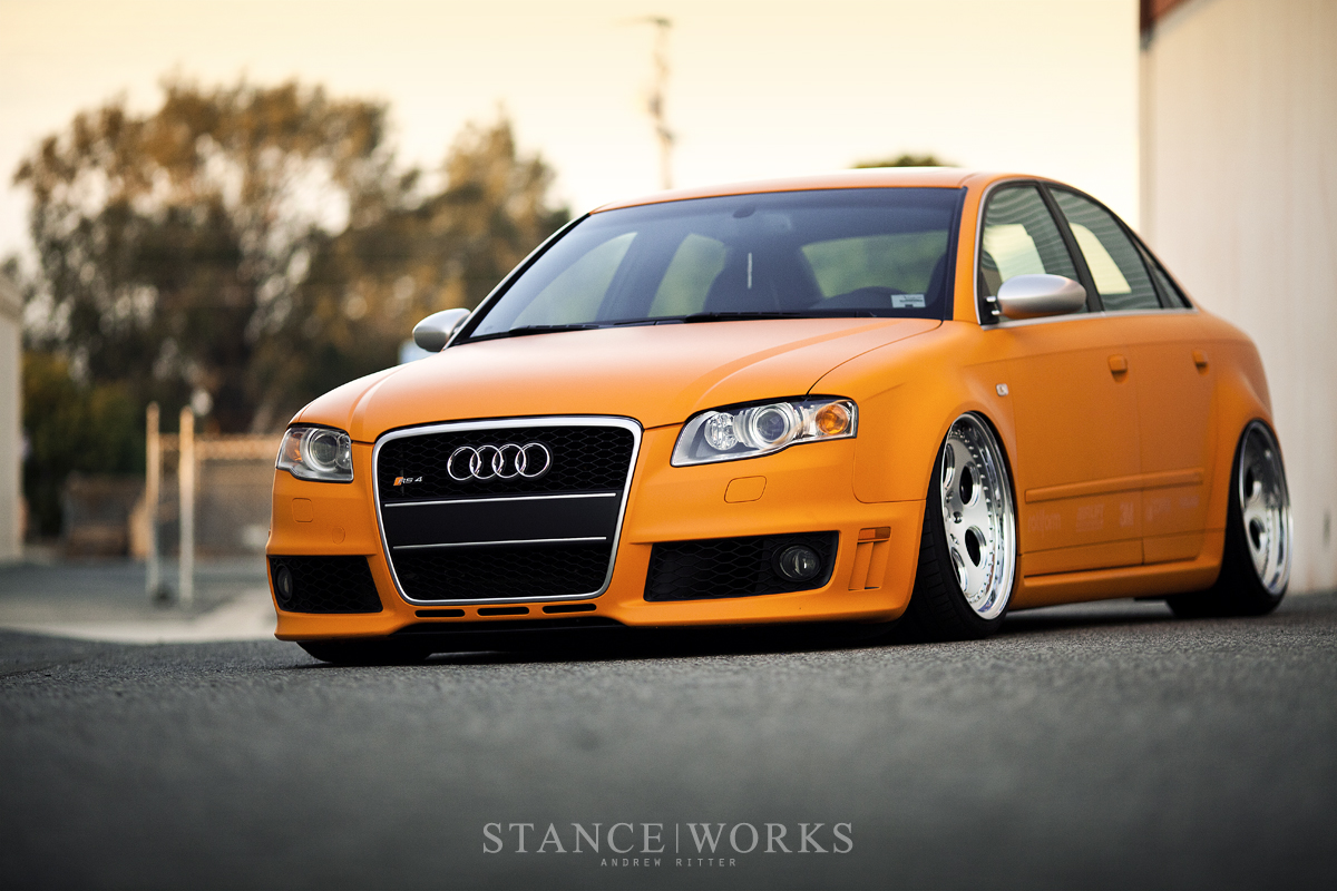 This vibrant 2007 Audi RS4, wrapped in matte orange vinyl, elegantly pairs with Rotiform's DIA wheels for a striking look. It features a lowered stance courtesy of an Air Lift Performance air suspension, complementing its aggressive aesthetic with Falken tires and Brembo brakes peeking through. The custom interior and Scorpion exhaust system enhance both style and performance.