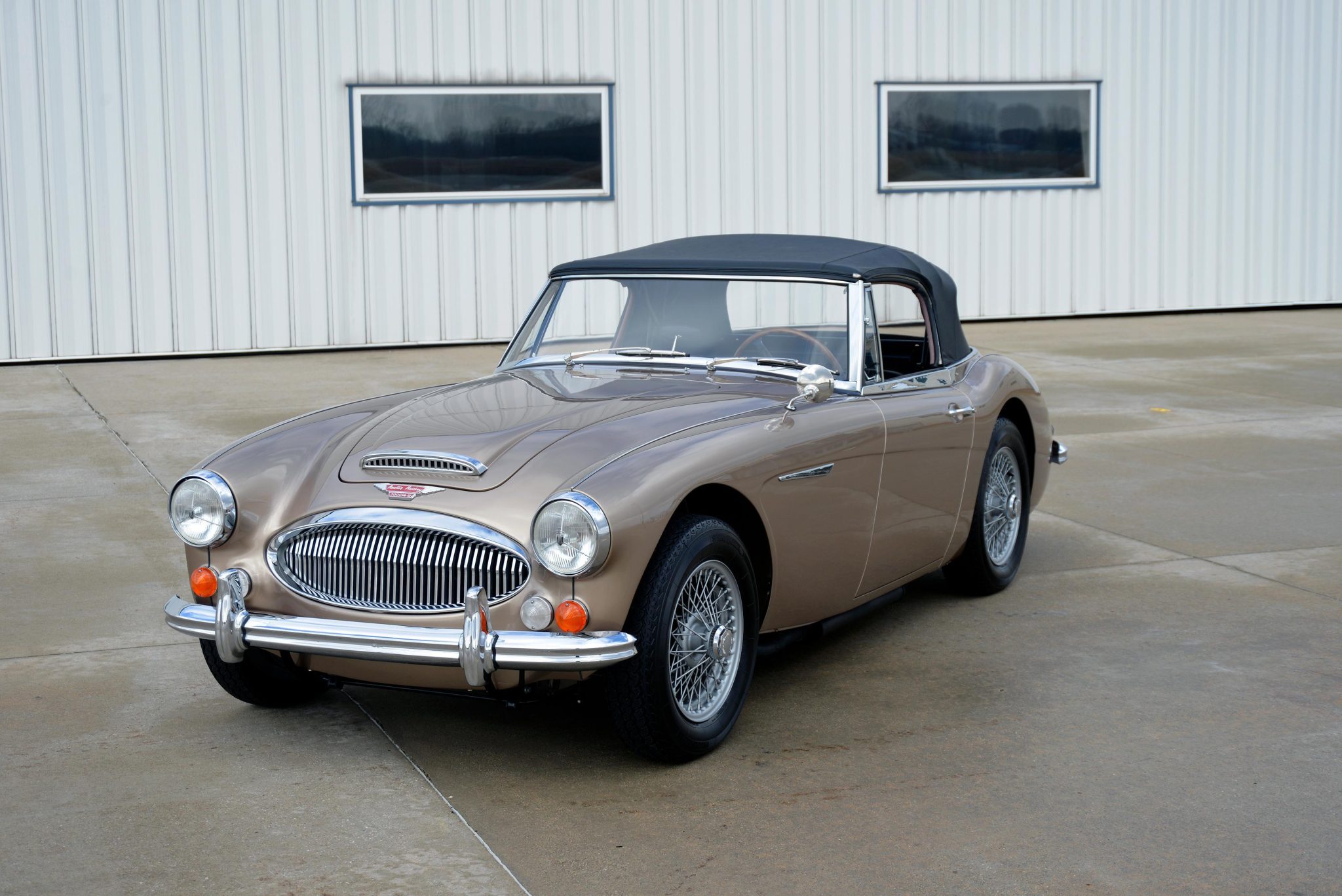 This 1967 Austin-Healey 3000 BJ8 Mk III boasts a bare-metal restoration, featuring a Metallic Golden Beige finish and a black leather interior. The roadster is powered by a rebuilt 2.9-liter inline-six with dual SU carburetors, riding on 15″ wire-spoke wheels and displaying classic British elegance.
