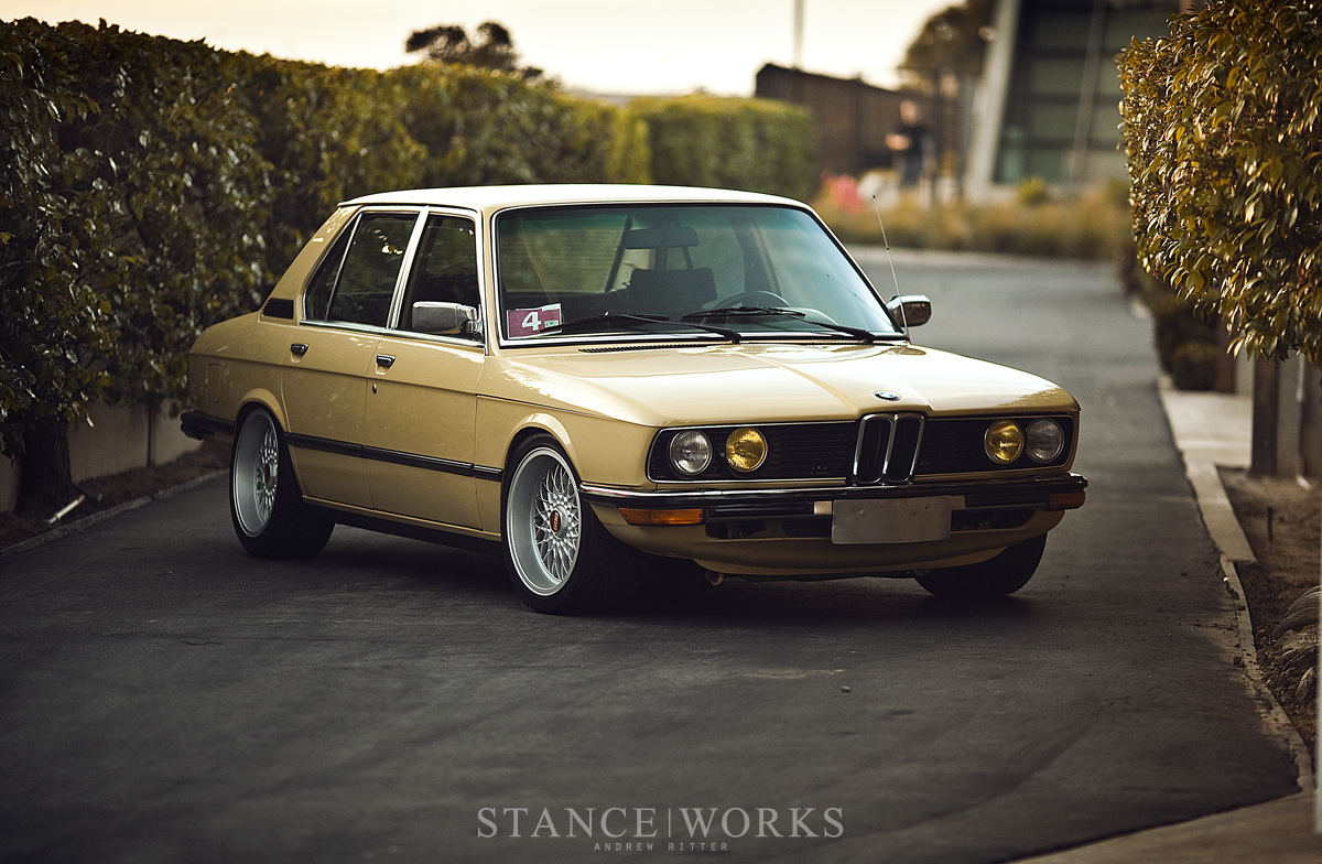 Ron Perry's BMW E12 is a masterclass in understated elegance, featuring a potent 3.9-liter M30 engine with triple Weber carbs, nestled in a subtle Sierra Beige shell. The transformation includes sporty Scheel seats, and refined black interior detailing, with a touch of OEM+ flair from 17x8.5 BBS RZ wheels, making it the perfect sleeper sedan.