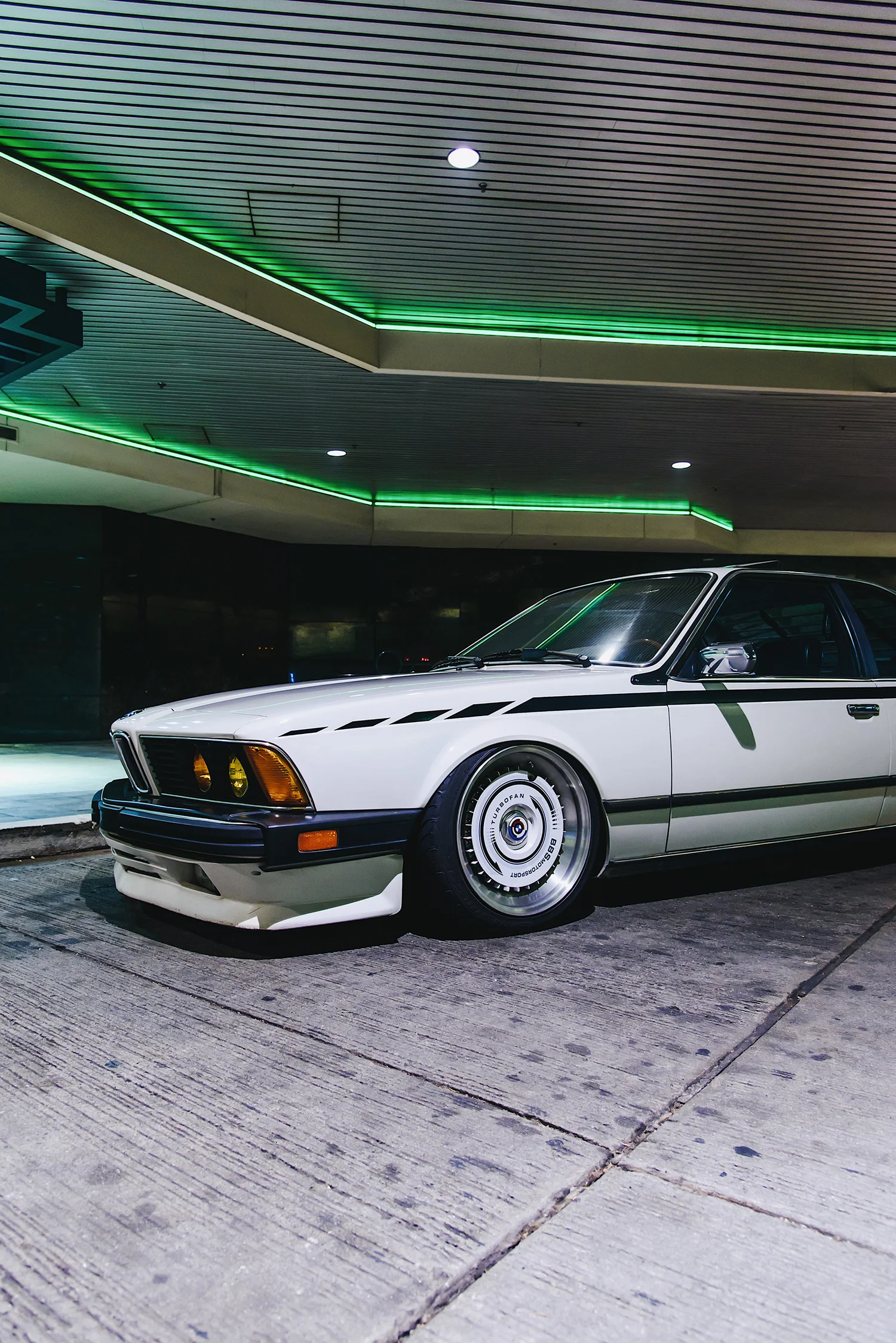Jonny Reiswig's 1987 BMW 635CSi showcases a captivating blend of vintage motorsport charm with a custom aesthetic often seen in Japanese car styling. The distinct BBS RS wheels with custom turbofans and retro BMW Motorsport center caps pair seamlessly with the bespoke side graphics and wooden rear window blinds, giving the classic E24 a unique and timeless appeal.
