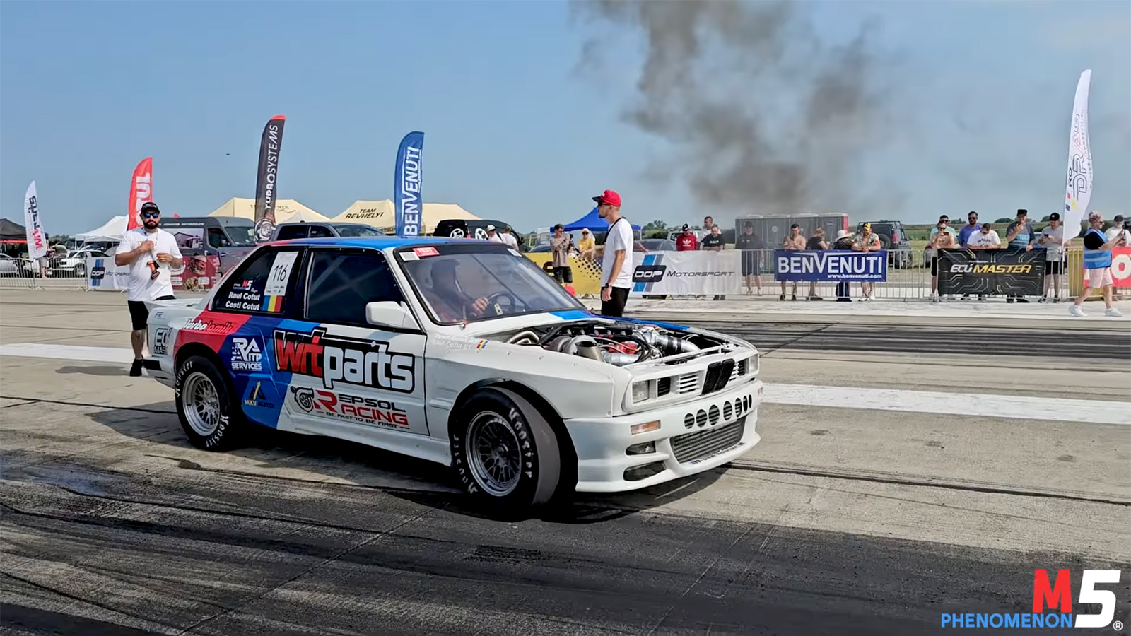 Raul Cotut's BMW E30 is a standout with a compound turbocharged M50 inline-six engine producing 1,100 hp. It features a 4WD drivetrain and is equipped with an 8HP eight-speed automatic transmission managed by a TurboLamik TCU. This powerful setup allows the E30 to run several 8-second passes. The car was showcased at RoDrag Racing in Arad, Romania.