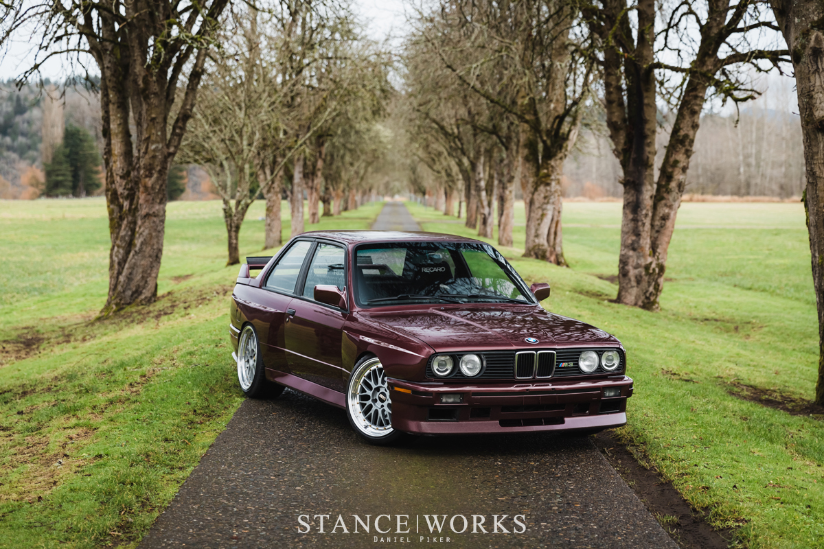 This E30 M3 boasts a blend of elegance and performance with its Merlot Red respray and a precise stance courtesy of BBS LMs and a comprehensive suspension setup.