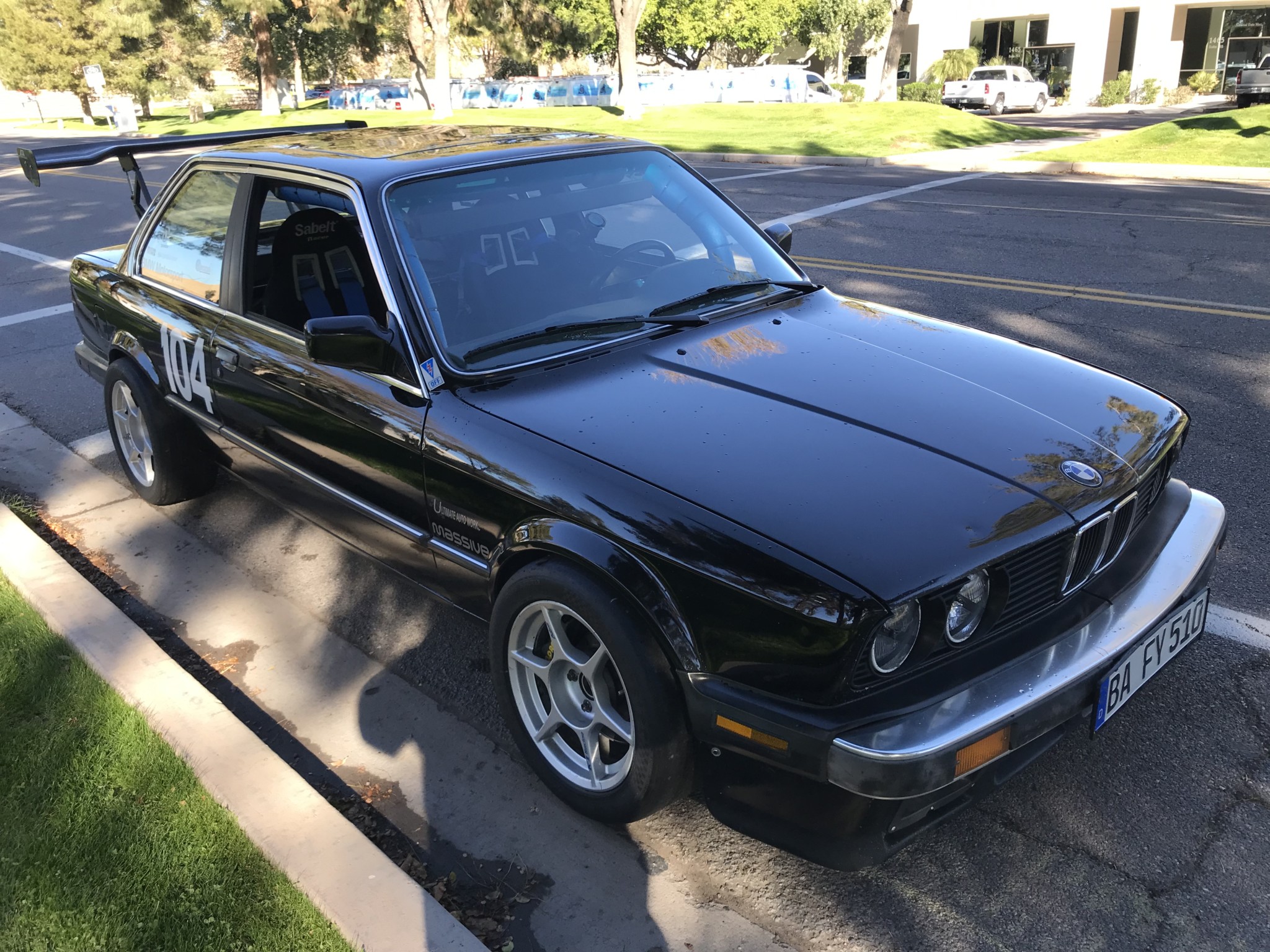 This 1987 BMW 325is has been transformed into a track-focused machine, featuring a 3.2-liter S52 inline-six engine paired with a ZF 5-speed manual transmission from an E36 M3. It includes several performance modifications such as a Turner Motorsports suspension setup, an APR carbon fiber wing, and AP Racing big brake kit. The car is fitted with Kosei K1 Racing wheels and Hoosier R7 slicks. Other notable changes include an Autopower roll cage, G-Force 5-point harness, and Sabelt Racer Duo racing seats. Despite its track capabilities, this E30 maintains street legality in Arizona. The body is finished in black with a carbon fiber sunroof panel.