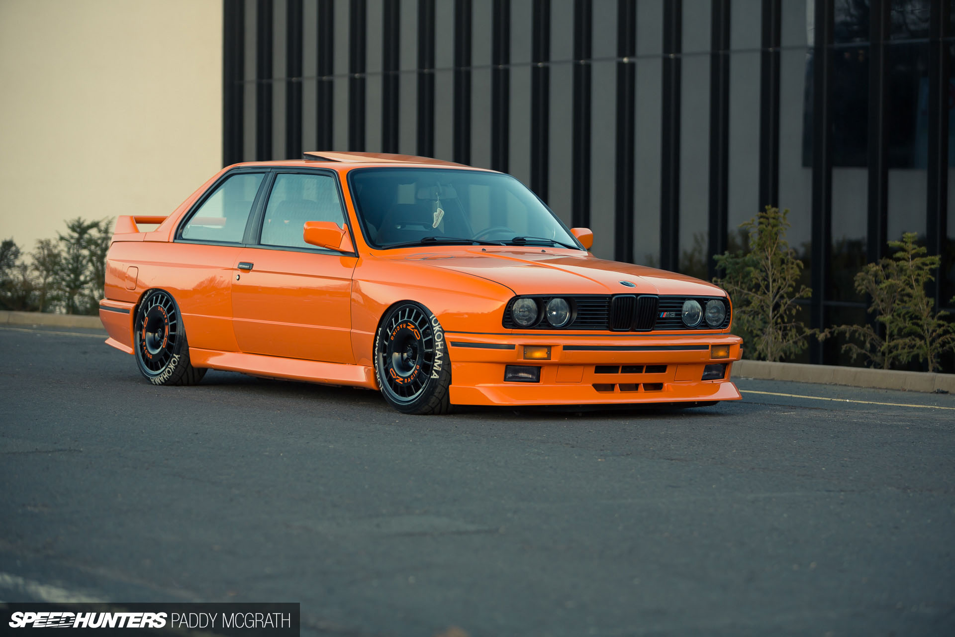 This BMW E30, built by Ergen Motorsport, features a powerful engine swap with a 3.2L S54B32 motor from a 2003 E46 M3. The engine is enhanced with custom equal length headers and an Alpha-N engine management system, producing 360 horsepower and 269 lb-ft of torque. The bright orange paintwork and aggressive styling make this E30 a standout build.
