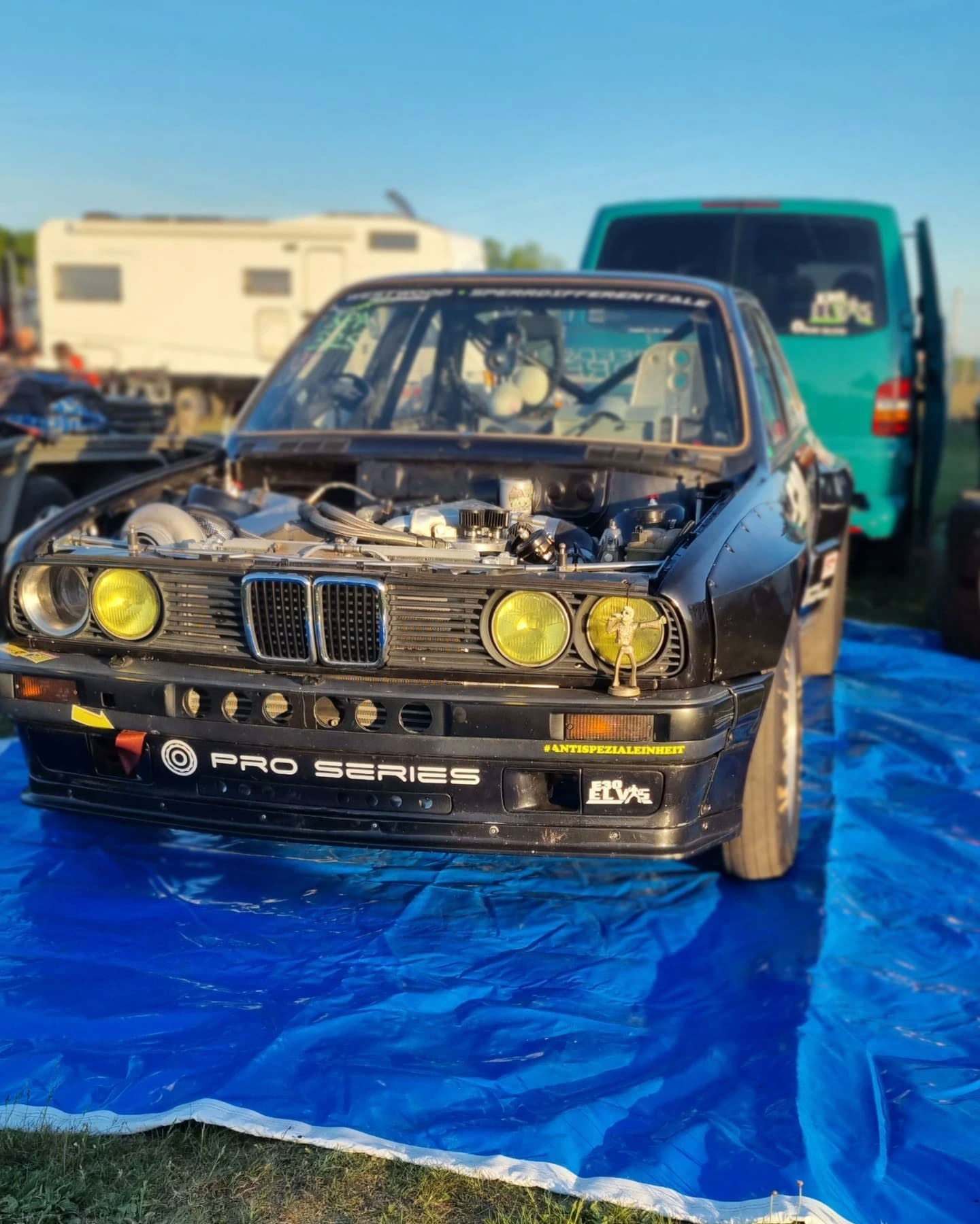 Daniel Schien's BMW E30, known as 'E30 Elvis', features a turbocharged M50B25 inline-six engine, producing over 1100 hp and 973 Nm of torque. At the Doorslammers event at Santa Pod Raceway, it achieved a personal best of 8.162 seconds at 172 mph. It is equipped with a GearMotive H-pattern ZF dogbox and an upgraded rear end.