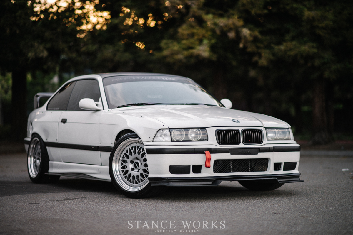 This BMW E36 M3 embodies a blend of power and precision, evidenced by its S54 engine swap and track-focused enhancements. Fitted with Felony Form overfenders and a carbon LTW wing, the white coupe is as striking as it is performance-driven.
