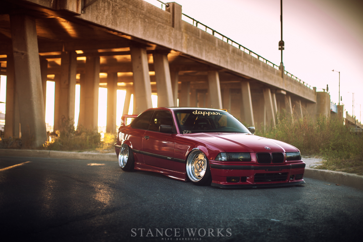 Shaun Quill's BMW E36 328is, wrapped in red vinyl, showcases a radical approach with its low stance and extensive wheel setup. Fitted with polished OZ Breyton splits, 9.5-inch wide fronts and 17x11-inch rears, the car pushes boundaries and embraces a ‘carefree’ aesthetic that divides opinions.