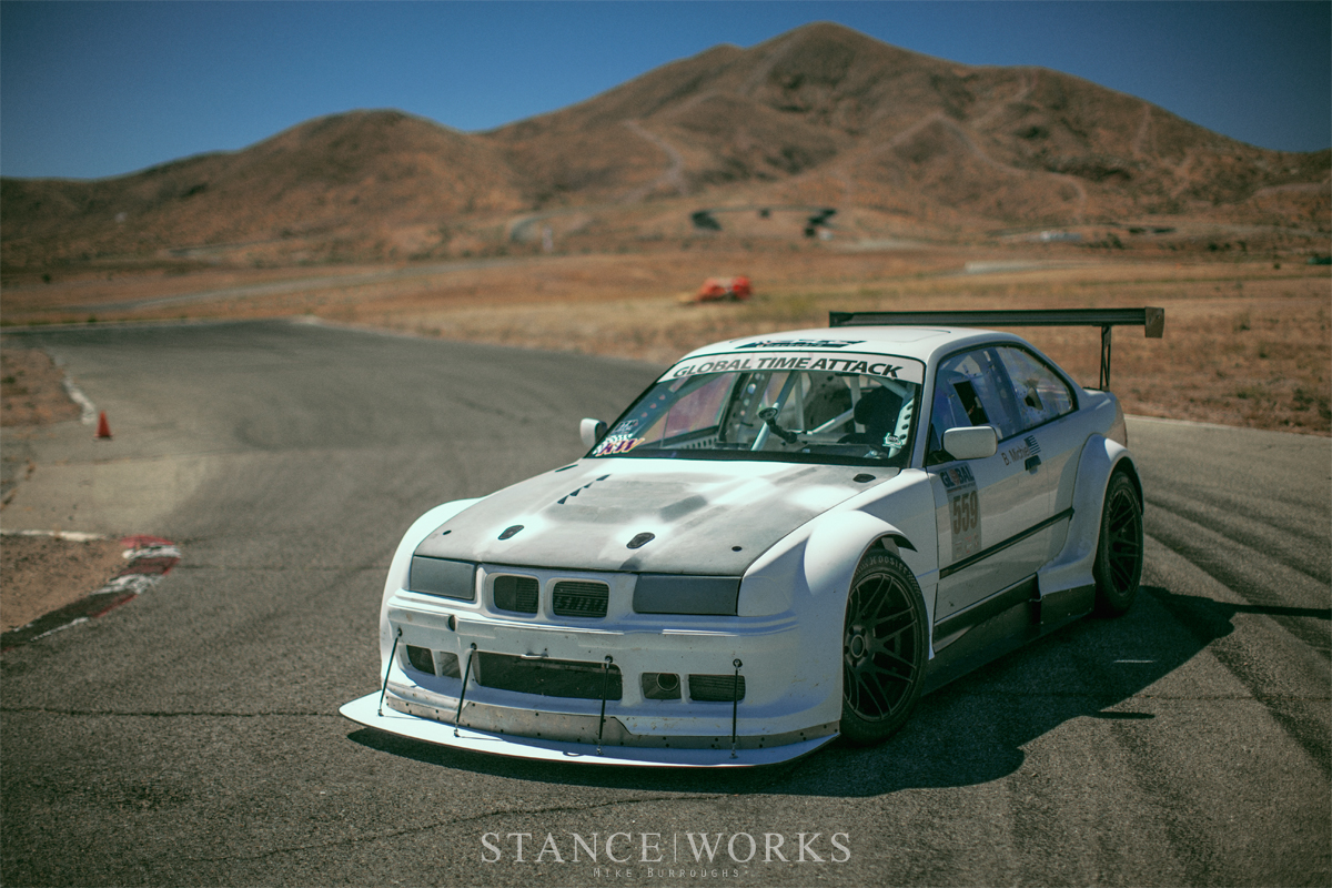 This BMW E36, powered by an LS V8, is a purpose-built track machine. Its widebody look is complemented by aggressive aero components like a large diffuser and a prominent spoiler, enhancing its performance in the Global Time Attack series. The white exterior wraps a bare-bones interior focused purely on speed, with KW coilovers and sizable Hoosier tires providing traction.
