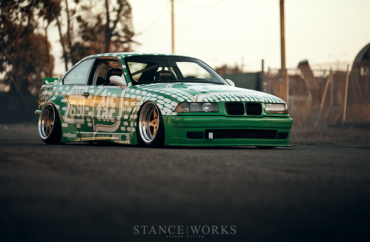 Carl Taylor's BMW E36 M3 dazzles with a standout Tic Tac-inspired livery at SEMA, underpinned by a Rocket Bunny widebody kit. The slim coupe is set off with Rotiform ROC wheels and an Air Lift suspension, embodying a spirited mix of retro charm and modern flair.