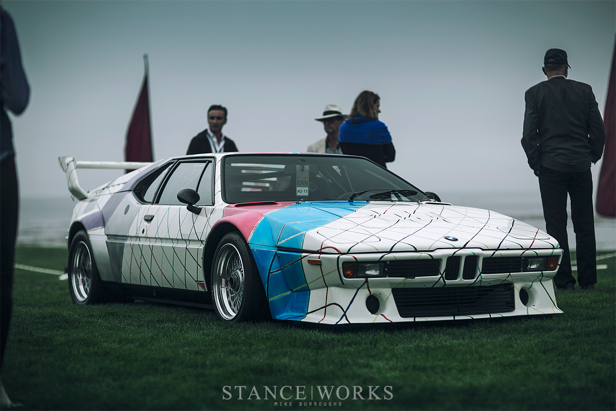 This BMW M1 Procar stands out with Frank Stella's striking livery from his 'Polar Co-Ordinates' series, celebrating the memory of racing legends Ronnie Peterson and Peter Gregg. As a tribute not officially part of BMW's Art Car program, it carries a poignant history while showcasing a blend of automotive excellence and art.