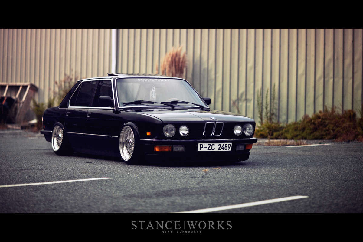 Jeremy Whittle's BMW E28 features a 1JZ engine swap with a single turbo conversion, giving new life to this classic sedan. Its stance is achieved with a custom Air Lift suspension, while vintage HRE wheels and a black paint job provide an era-correct, understated look.