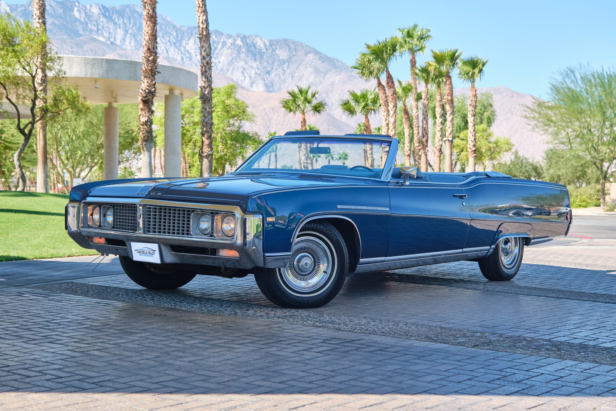 This 1969 Buick Electra 225 Custom convertible is finished in striking blue with a power-retractable white top. Equipped with a 430ci V8 engine and adorned with chrome trim, fender skirts, and 15" wheels with whitewall tires, it offers classic luxury with modern touches like a Bluetooth receiver.