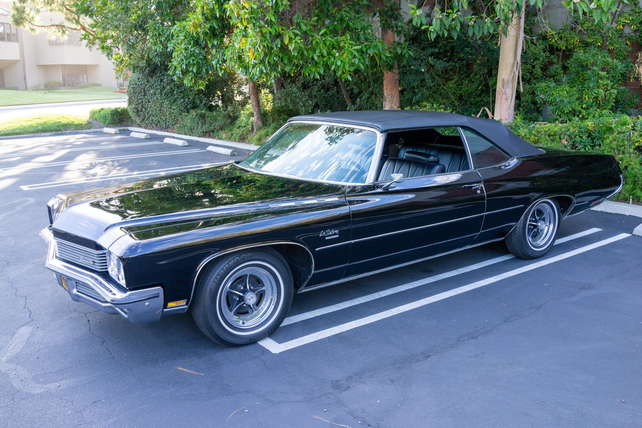 This 1972 Buick LeSabre Custom convertible showcases a classic triple-black finish, featuring a rebuilt 455ci V8 engine with modern upgrades such as electronic fuel injection and a custom dual exhaust. The convertible offers a luxurious ride with its reupholstered black vinyl interior, power-operated front bench seat, air conditioning, and stylish 15” Rally-style wheels.