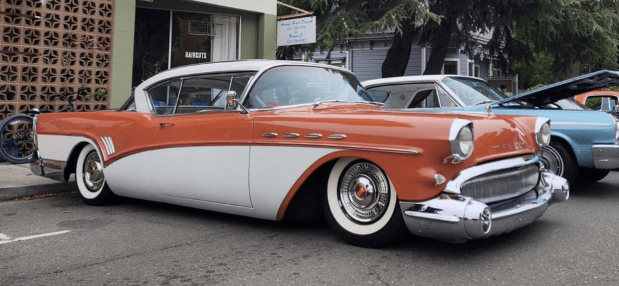 This 1957 Buick Roadmaster Riviera is a beautifully restored hardtop coupe featuring a striking two-tone Dover White and Bittersweet Red paint. Enhanced with modern amenities like an Air Lift Performance air-suspension and Hot Rod Air climate control, it combines classic style with contemporary comfort.