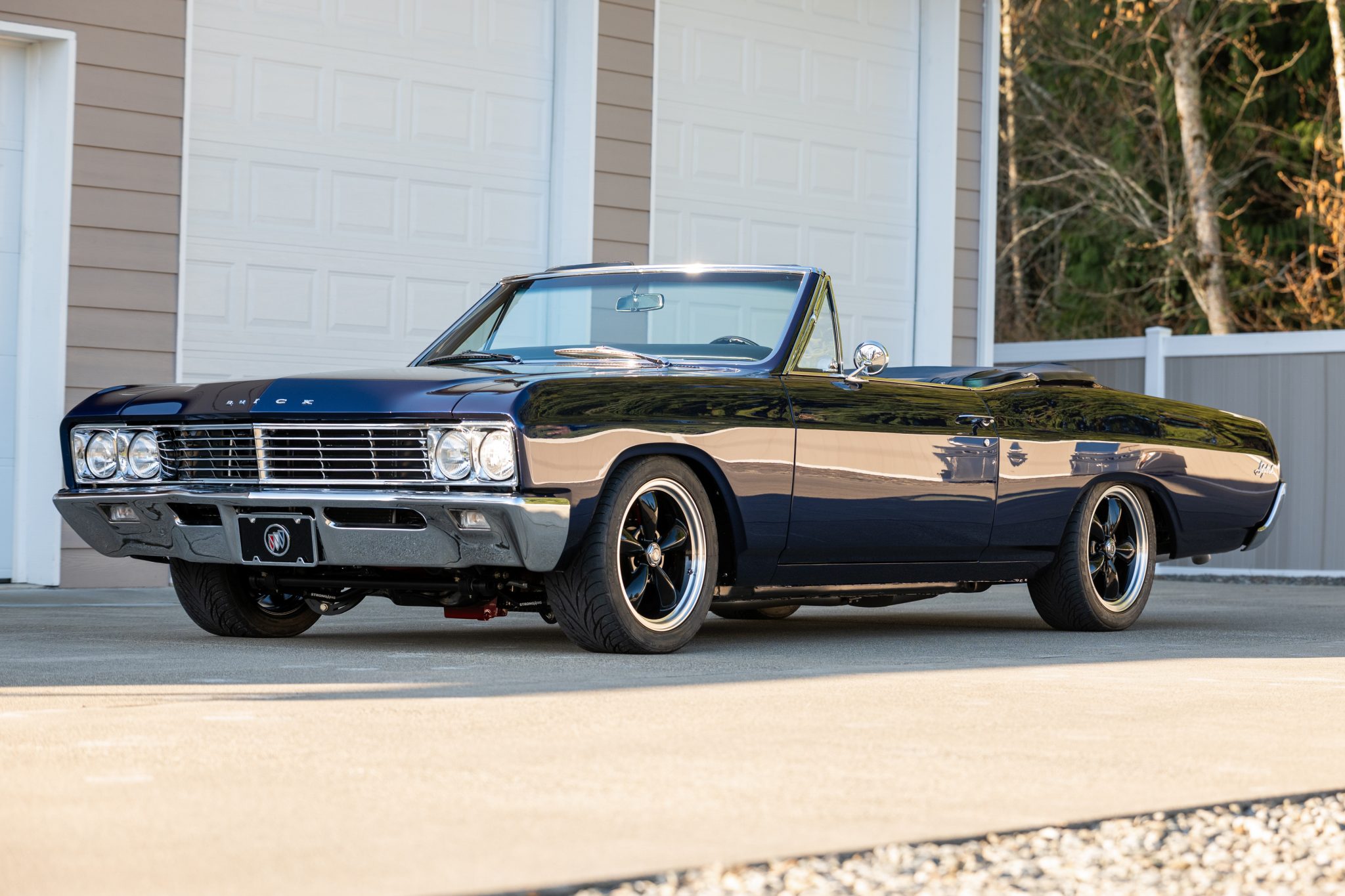 This sleek 1967 Buick Skylark convertible stands out with its Kona Blue Metallic finish and LS3 V8 power. Enhanced with Ridetech coilover suspension, it rides on 17" American Racing wheels and features Wilwood disc brakes. The interior blends classic style with modern amenities like Dakota Digital gauges and Vintage Air climate control.