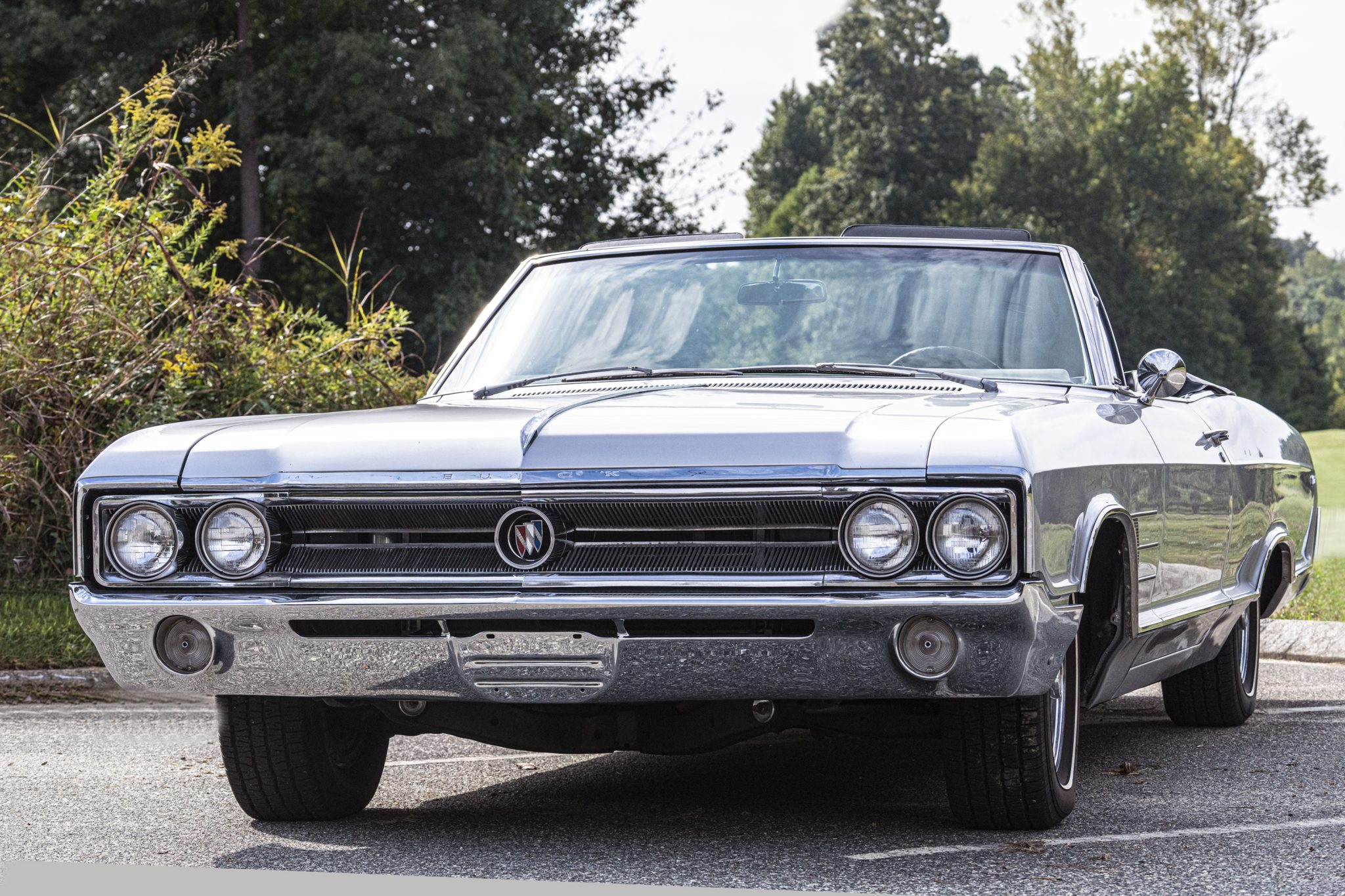 This 1965 Buick Wildcat Custom convertible, finished in silver over black vinyl, radiates classic American style. Powered by a robust 425ci Nailhead V8 paired with a three-speed automatic transmission, it features chrome 15" Rally wheels and amenities like air conditioning and power windows. The convertible's elegance is enhanced by its chrome trim and distinct styling.