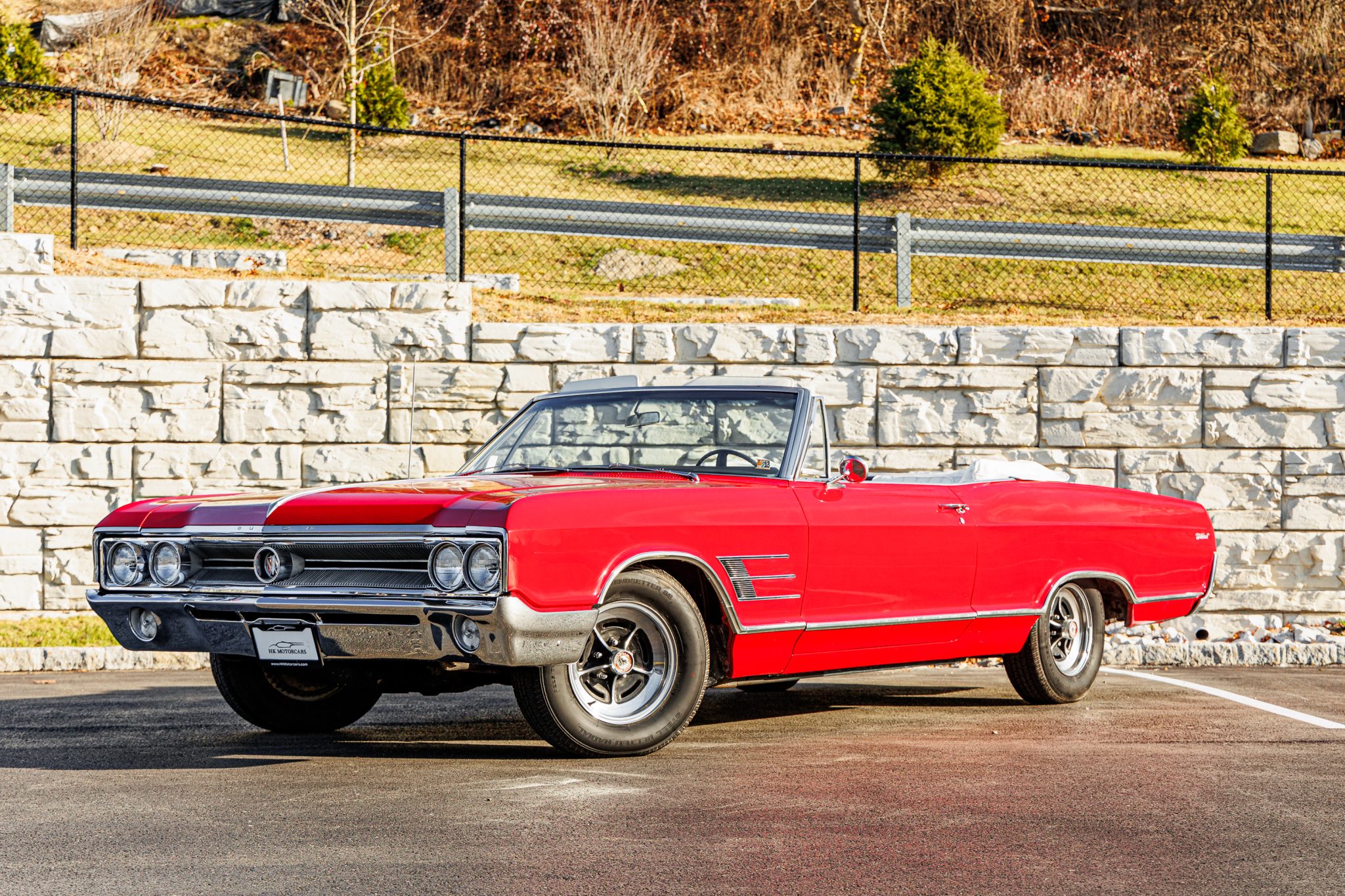 This striking 1965 Buick Wildcat Custom Convertible, originally finished in Seafoam Green and Regal Black, now boasts a bold red exterior with a white vinyl interior. Its classic convertible charm is paired with a 401ci Nailhead V8 and distinctive Rally wheels, making it a true representation of 1960s American style.