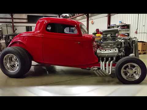 This vibrant red Ford 3-Window Coupe replica features a fiberglass body and is equipped with a supercharged 354ci Hemi V8 and distinctive American Racing wheels. Its aggressive stance and chrome details are complemented by a well-appointed interior, making it a striking hot rod build.