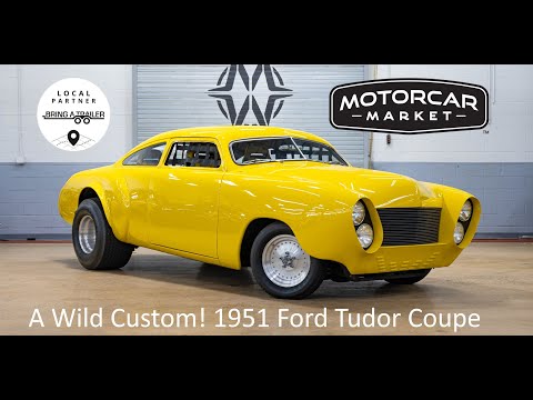 This vibrant yellow 1951 Ford Tudor Sedan exemplifies classic custom car culture with its dramatic chopped roof and tunneled headlights. Powered by a 440ci Chrysler V8, it features extensive modifications including a Mustang II-style front subframe and custom bodywork, giving it a unique hot rod character.