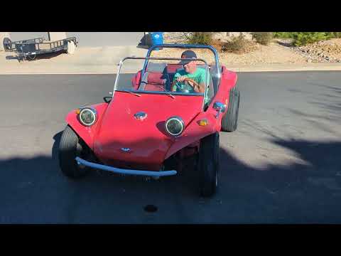 This vibrant red dune buggy features a fiberglass body on a modified Volkswagen chassis, powered by an air-cooled 1.6L flat-four engine. Accentuated with color-matched sidepods, gray-finished bumpers, and 15-inch alloy wheels, it blends vintage flair with modern touches including a Weber carburetor and EMPI shifter.