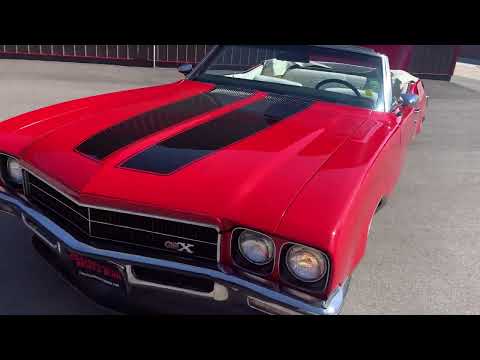 This vibrant red 1972 Buick Skylark Custom convertible exudes classic American style with its GSX-inspired black side stripes and chrome accents. Recently refinished, it features a power-operated convertible top and spoilers. The interior offers white vinyl upholstery with woodgrain trim, retaining a vintage flair with a Kraco cassette player and power steering.