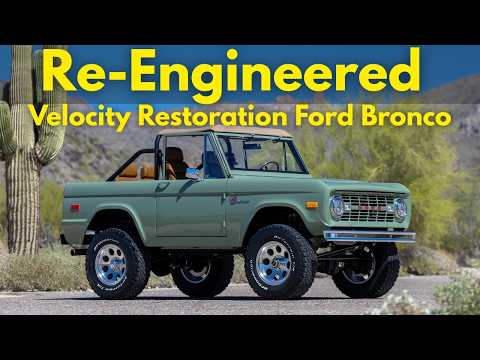 This Coyote-powered 1975 Ford Bronco, rebuilt by Velocity Restorations, showcases a stunning Boxwood Green finish with a tan canvas top. Equipped with a modern 5.0-liter V8, it features LED headlights, retractable side steps, and 17-inch Pacer wheels for an impressive look and strong off-road performance.