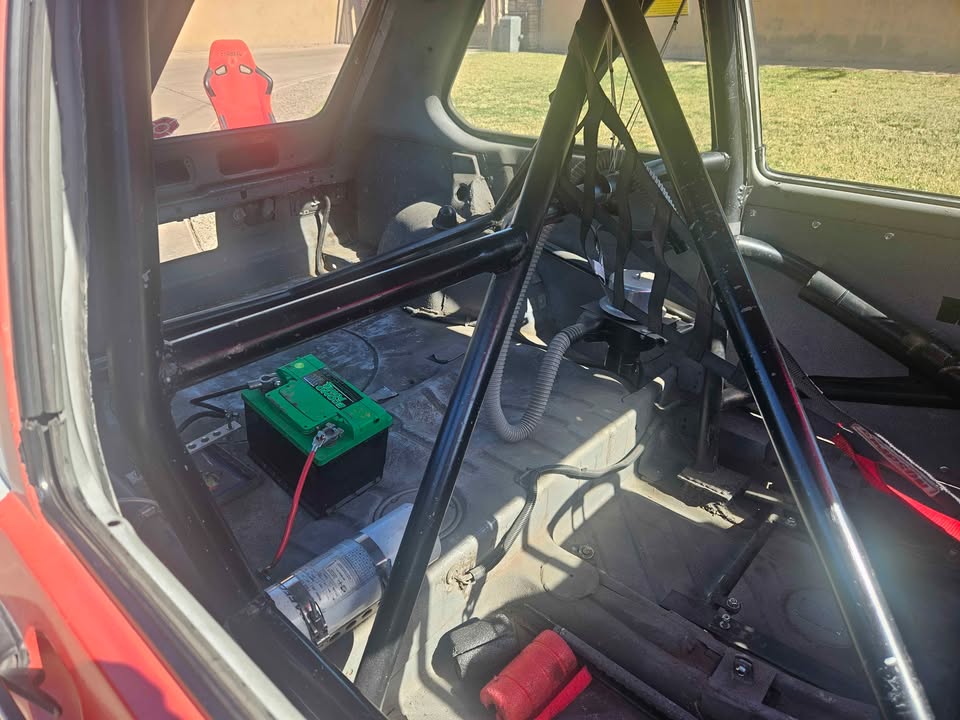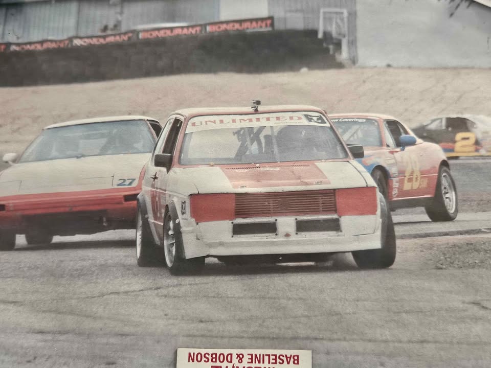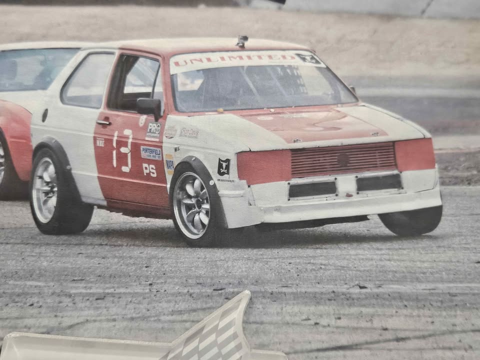 Track-ready Volkswagen GTI transformed into a PS4-themed race car in striking white and red livery, complete with roll cage and racing modifications.