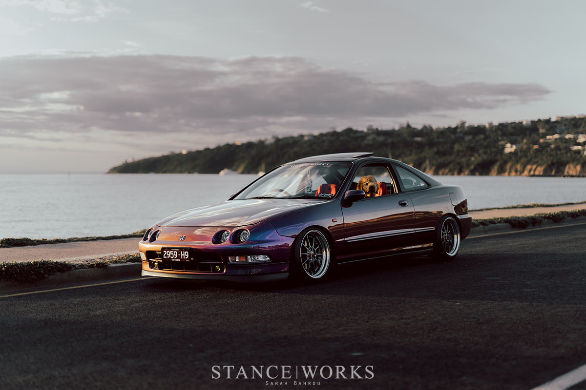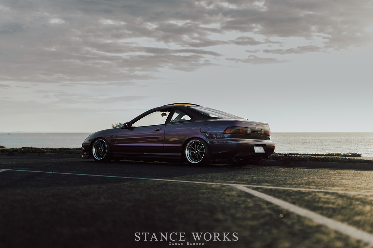 This 1994 Integra GSI exudes a late '90s-early '00s SoCal vibe with its newly refreshed engine and striking color-shift paint called 'People Eater.' Featuring Blitz Techno Speed wheels and BC BR coilovers, the car balances nostalgic styling with a modern twist.