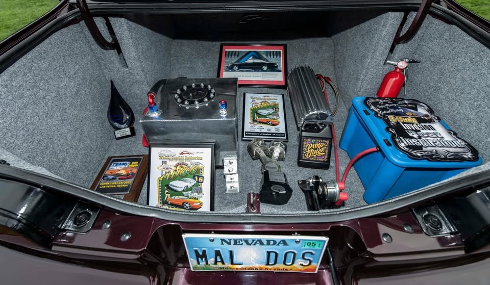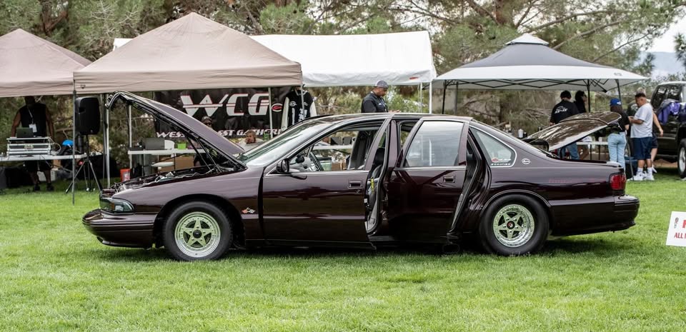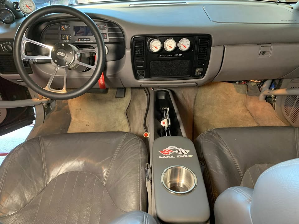 This 1995 Chevrolet Impala SS, affectionately known as 'MAL DOS,' features a complete rebuild with just 60k original miles. Its burgundy paint and grey interior complement a clean, classic look enhanced by polished deep-dish wheels.