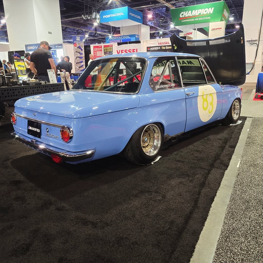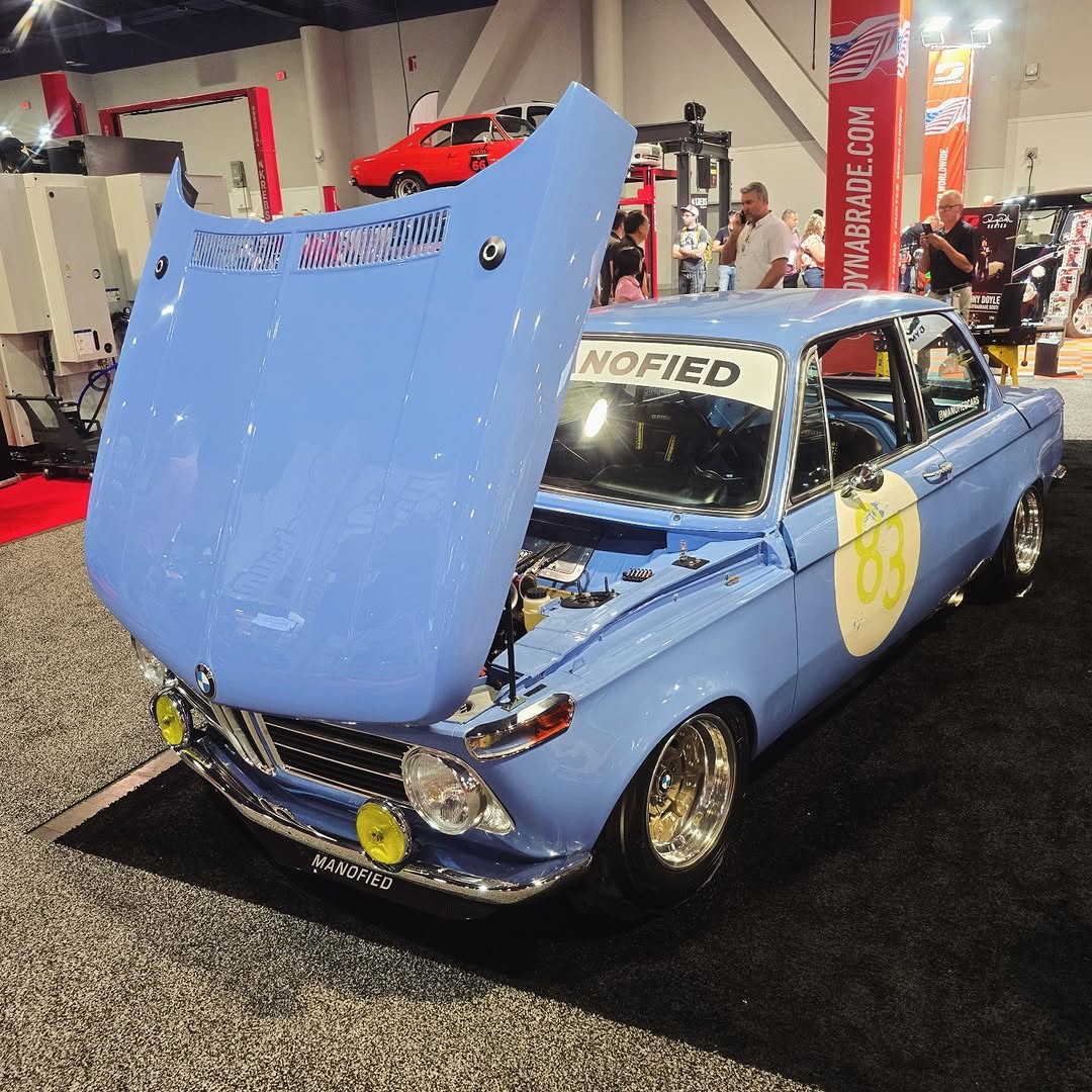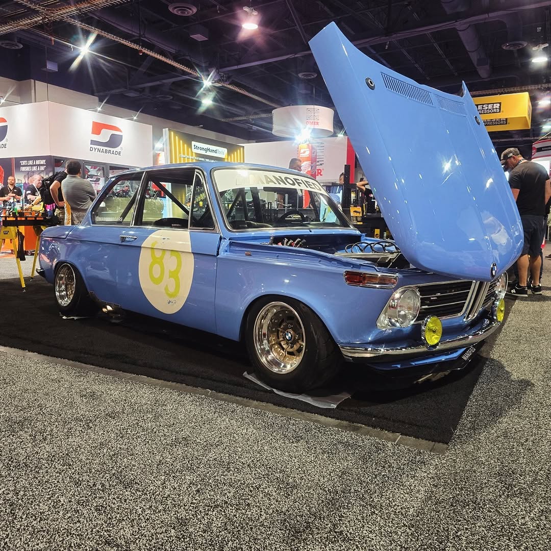 This BMW 2002 showcases a seamless blend of classic style and modern performance with a 90s 16V engine fitted with ITBs. Its light blue paint and racing decals add a vintage racing vibe.