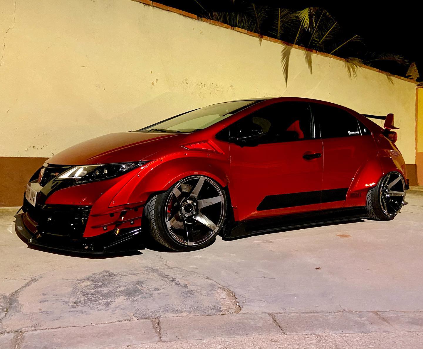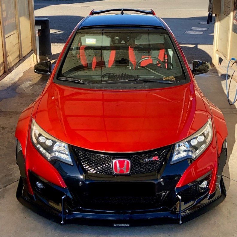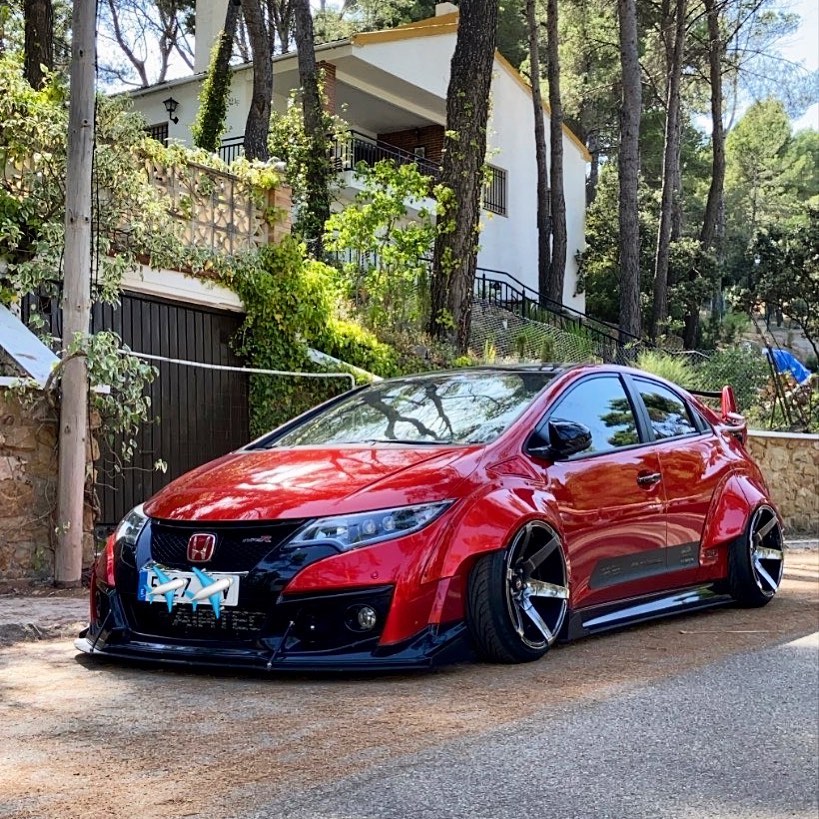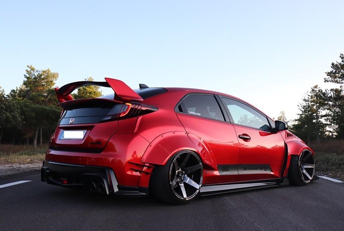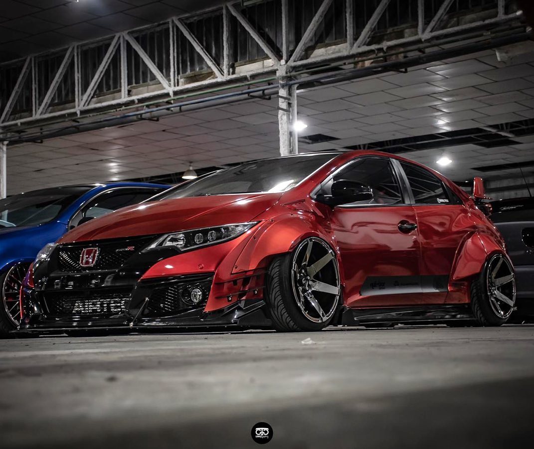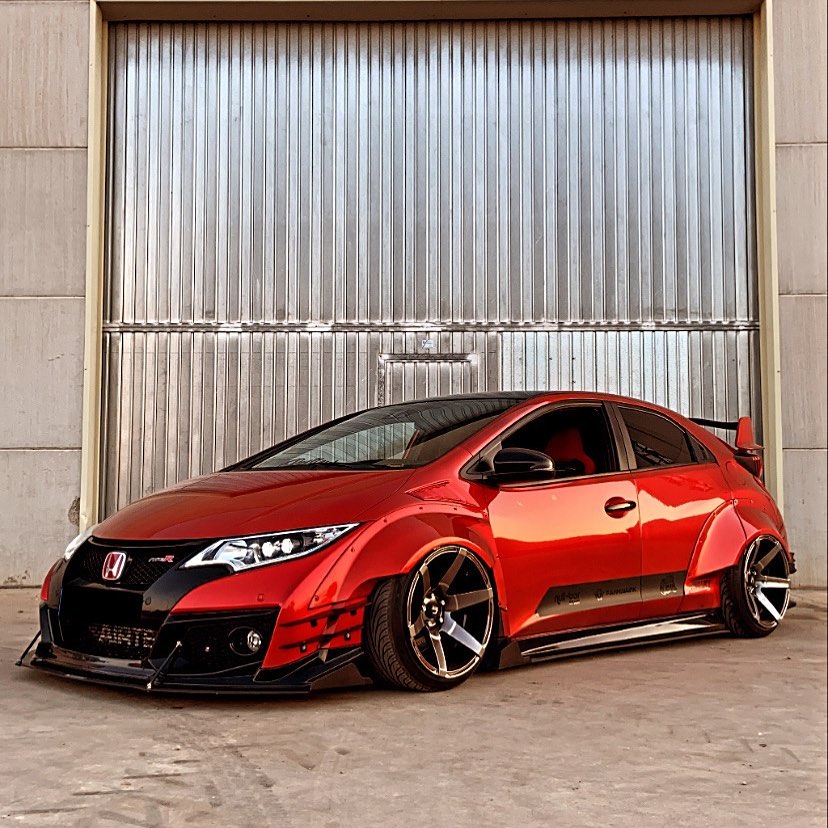 This Honda Civic Type R FK2, modified by Ventura_typeR32, features a striking Rocket Bunny widebody kit with massive flares bolted directly to the body, extending at least 3 inches. The aggressive stance is further enhanced by wider tires and air suspension, while an Airtec intercooler peeks through the front, hinting at performance upgrades. This unique build brings new appreciation to the often-overlooked FK2 generation.