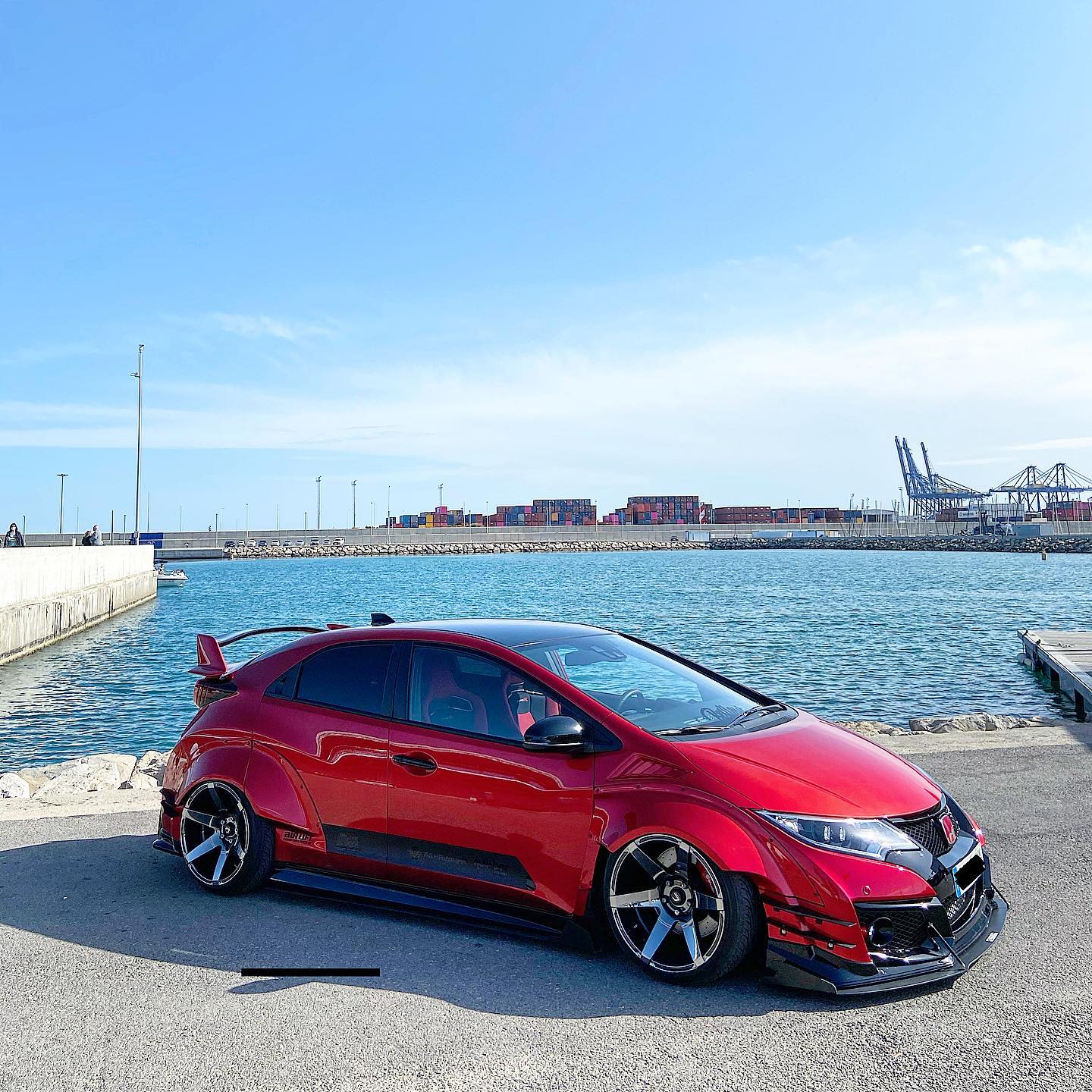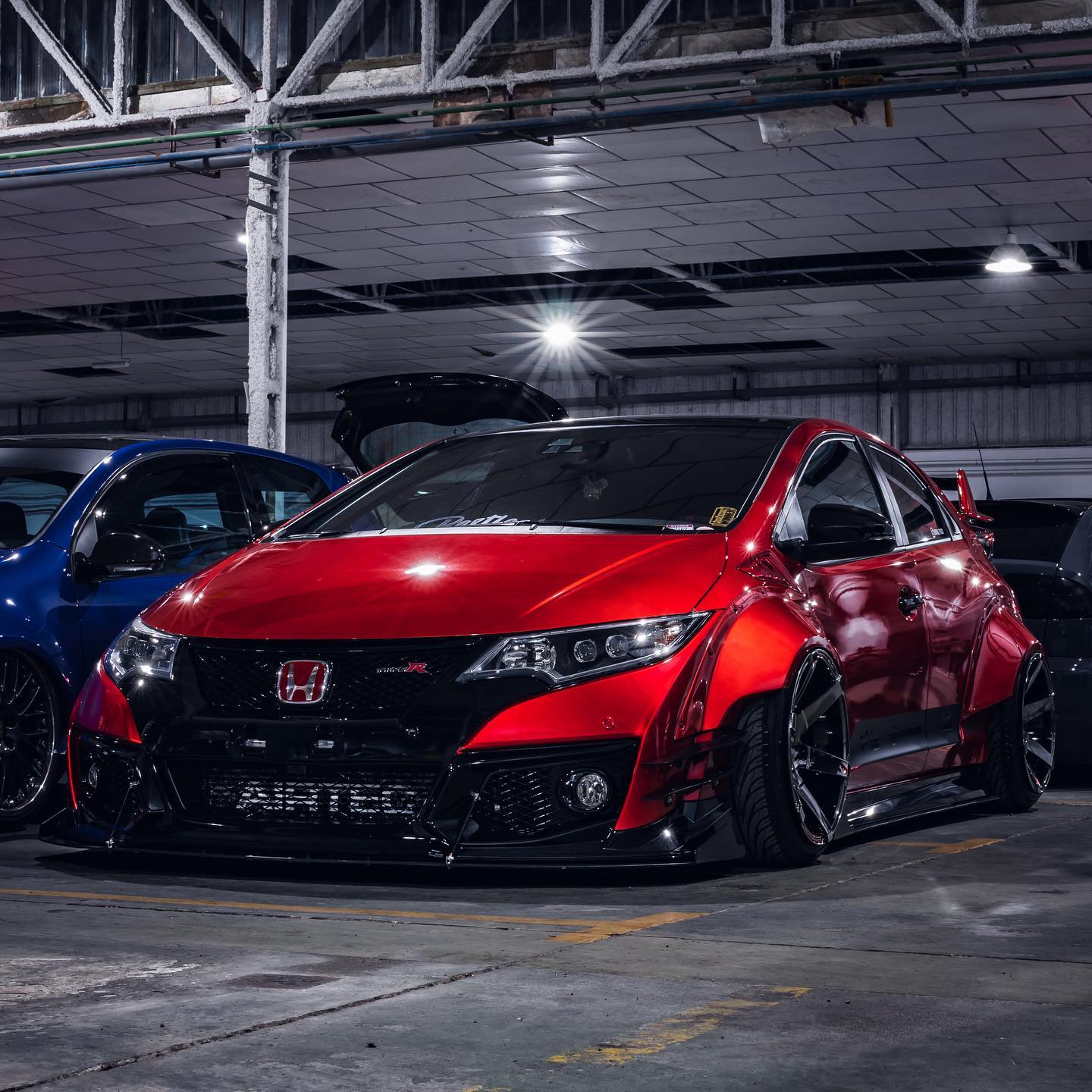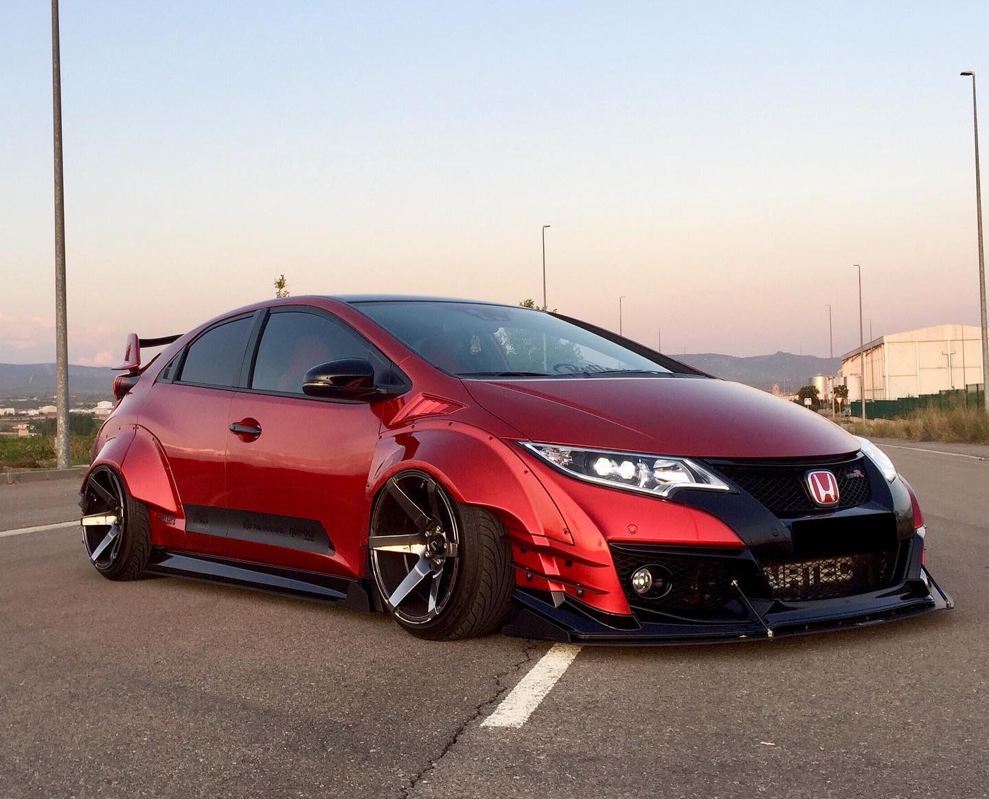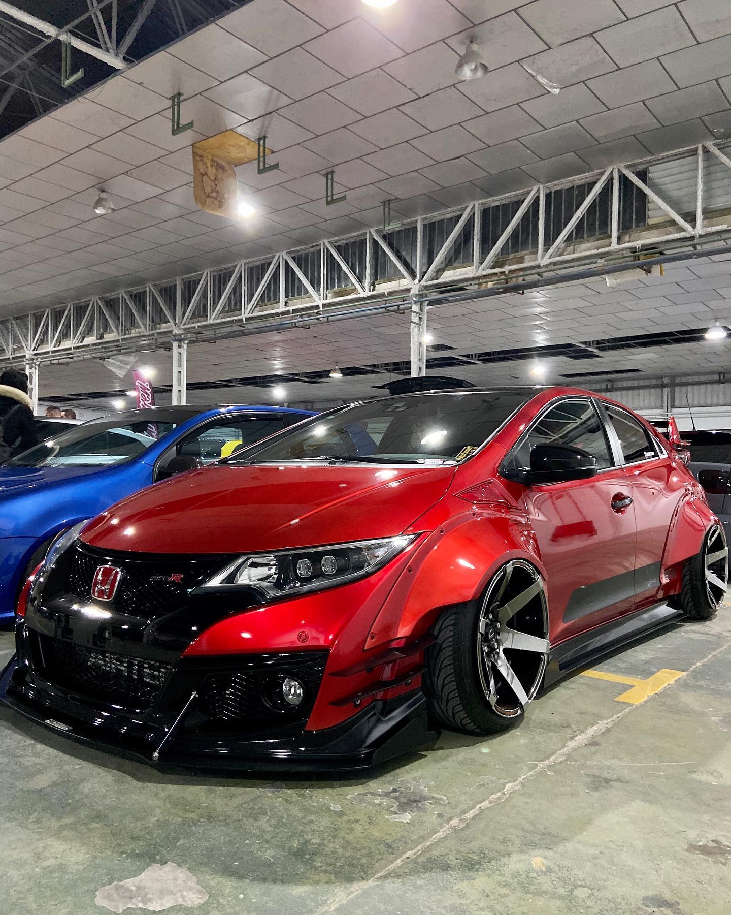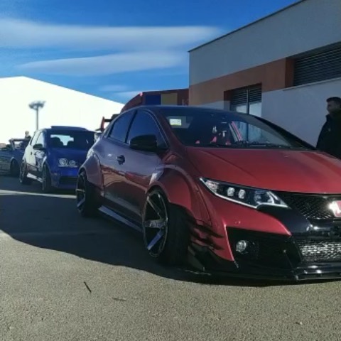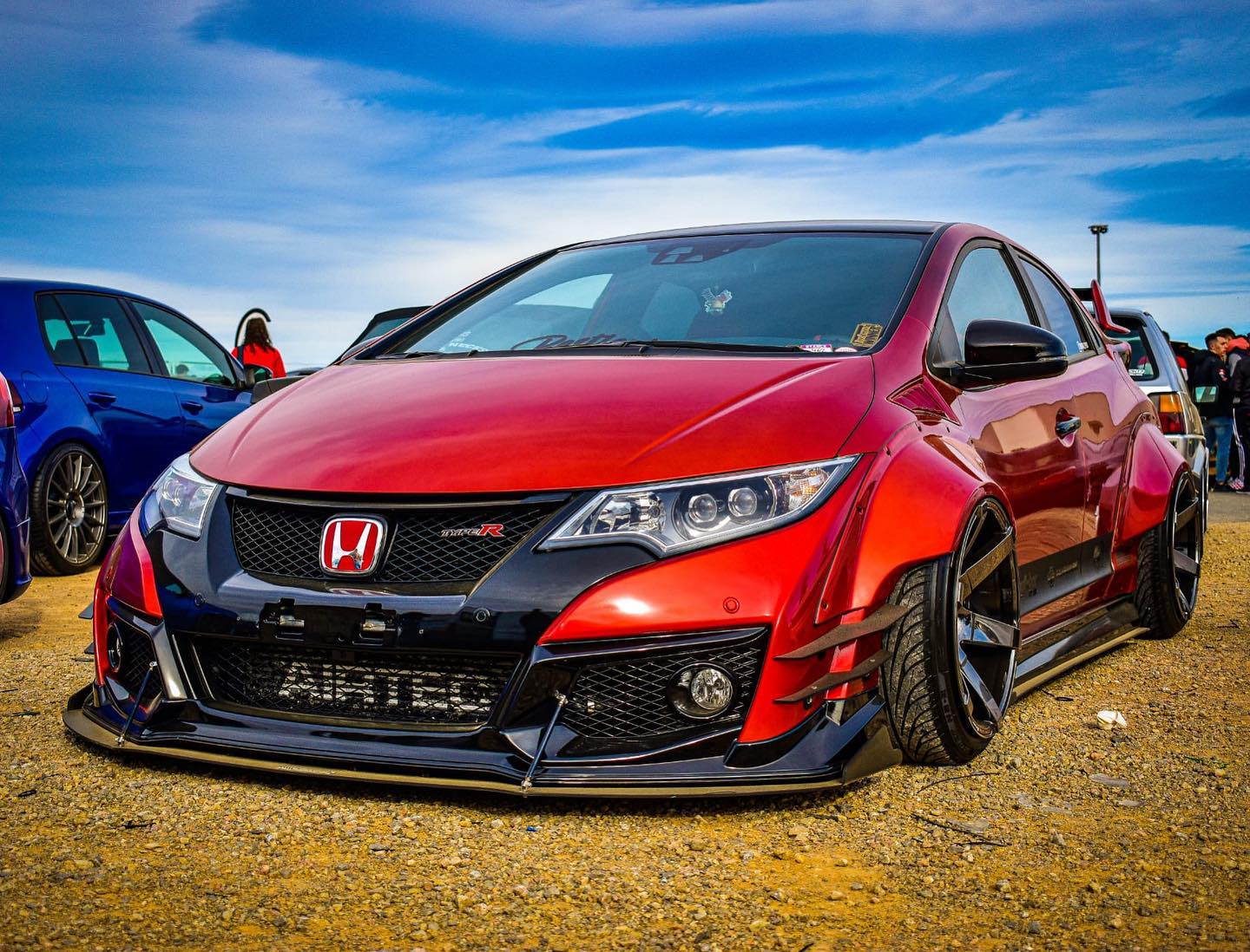 This Honda Civic Type R FK2, modified by Ventura_typeR32, features a striking Rocket Bunny widebody kit with massive flares bolted directly to the body, extending at least 3 inches. The aggressive stance is further enhanced by wider tires and air suspension, while an Airtec intercooler peeks through the front, hinting at performance upgrades. This unique build brings new appreciation to the often-overlooked FK2 generation.
