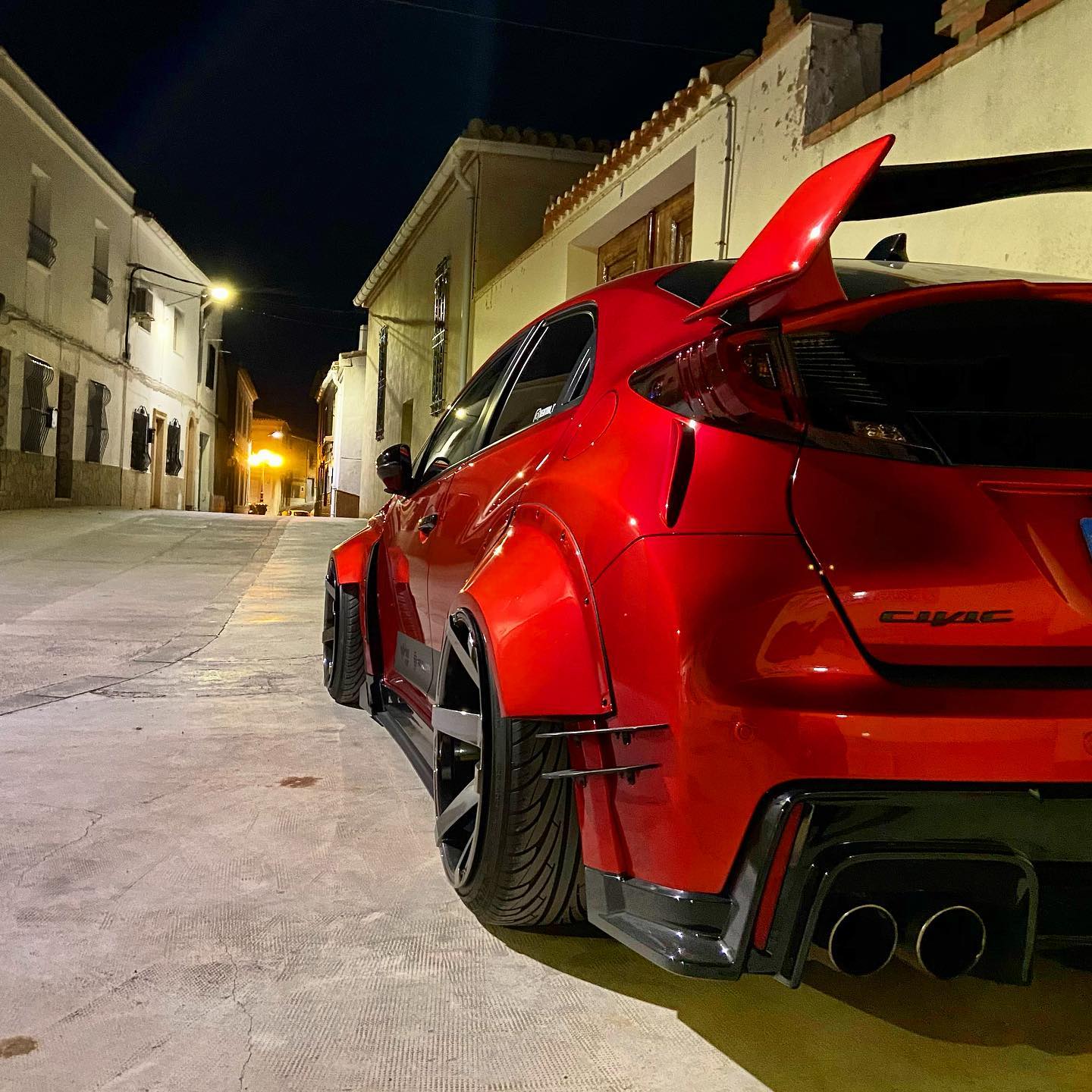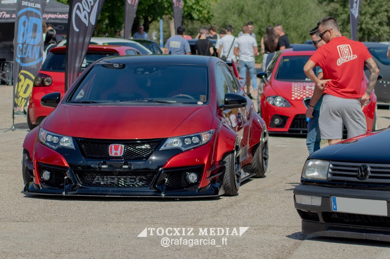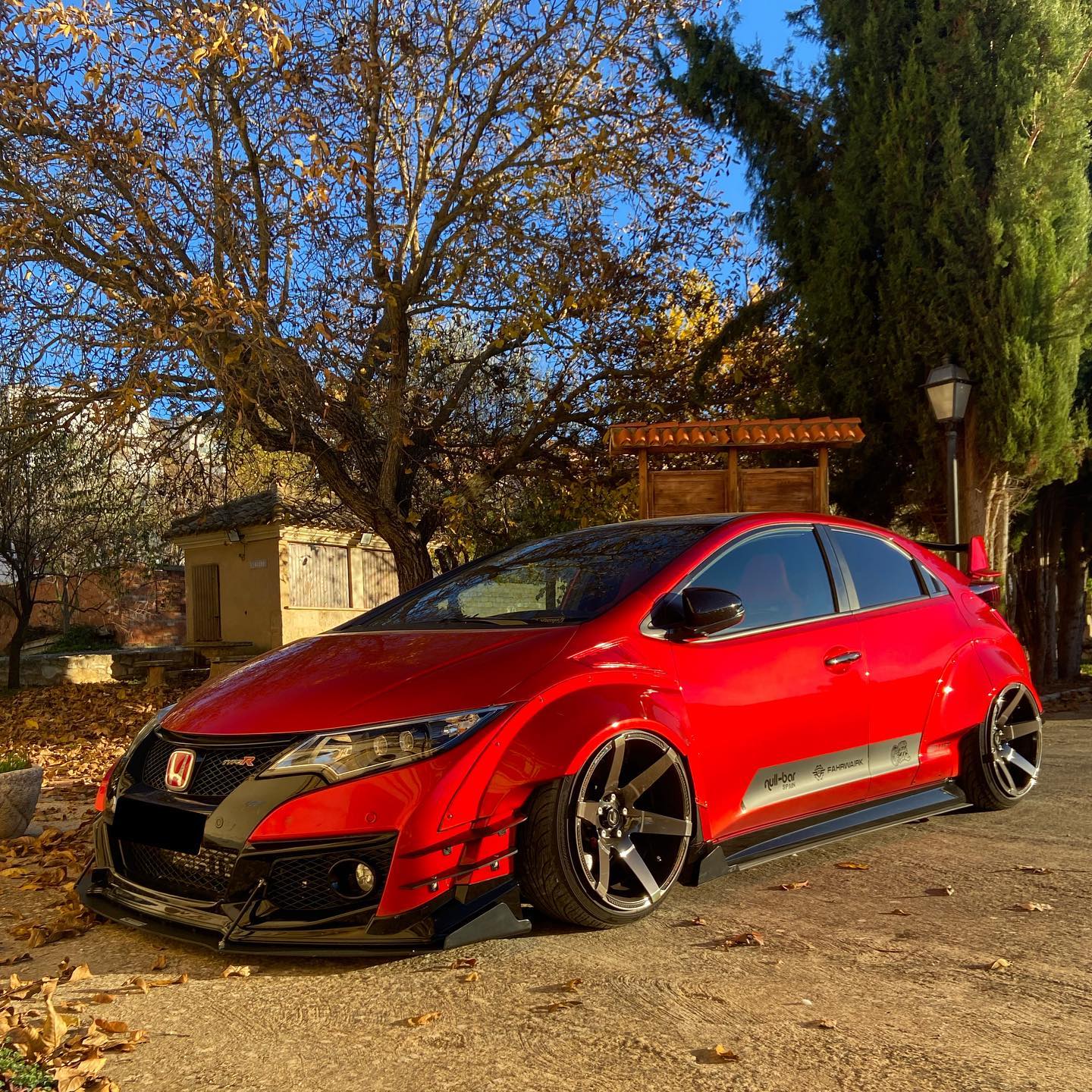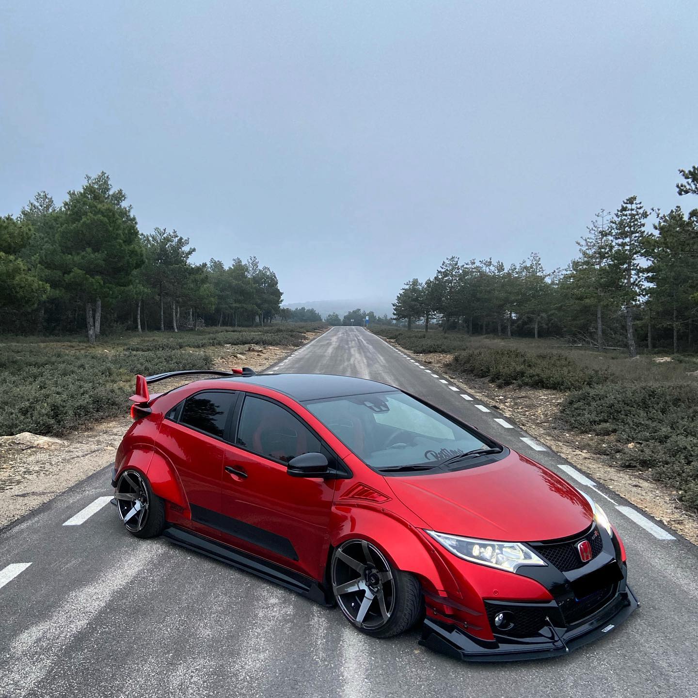 This Honda Civic Type R FK2, modified by Ventura_typeR32, features a striking Rocket Bunny widebody kit with massive flares bolted directly to the body, extending at least 3 inches. The aggressive stance is further enhanced by wider tires and air suspension, while an Airtec intercooler peeks through the front, hinting at performance upgrades. This unique build brings new appreciation to the often-overlooked FK2 generation.