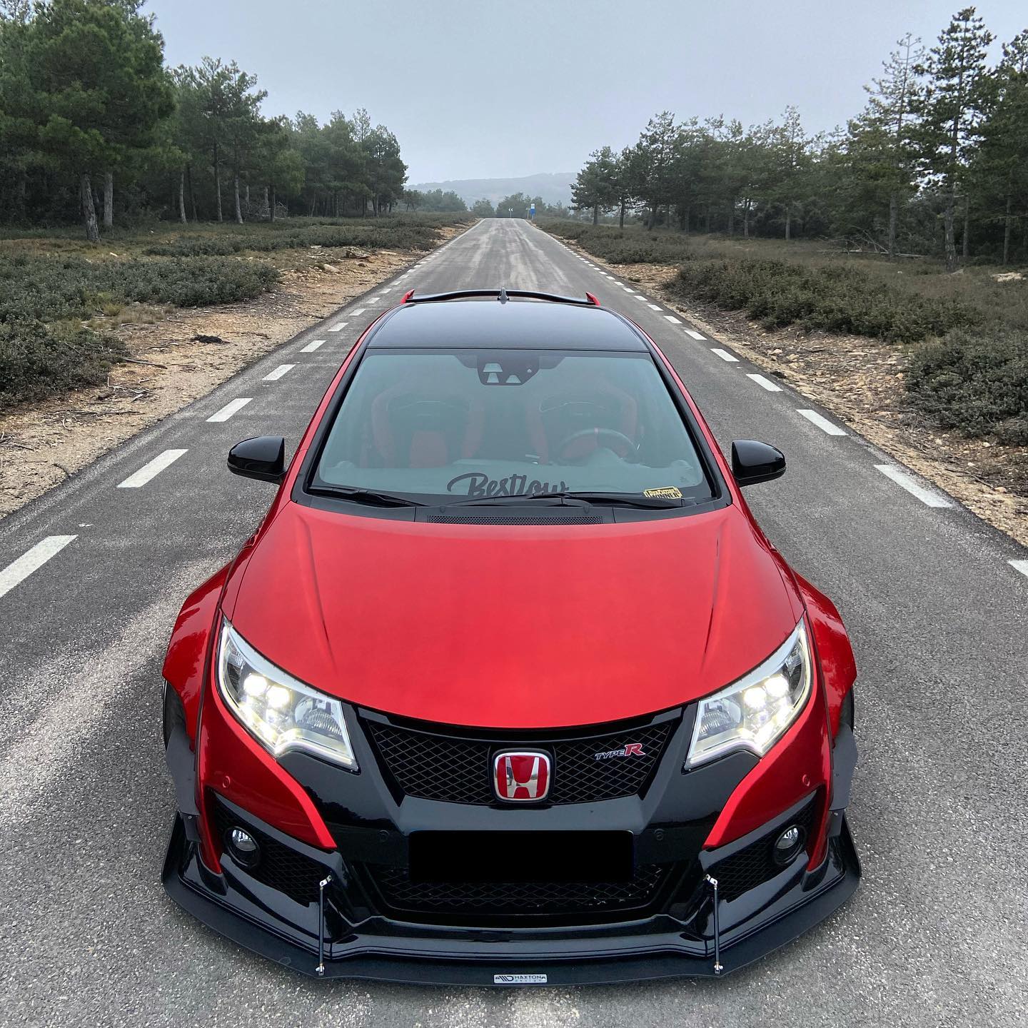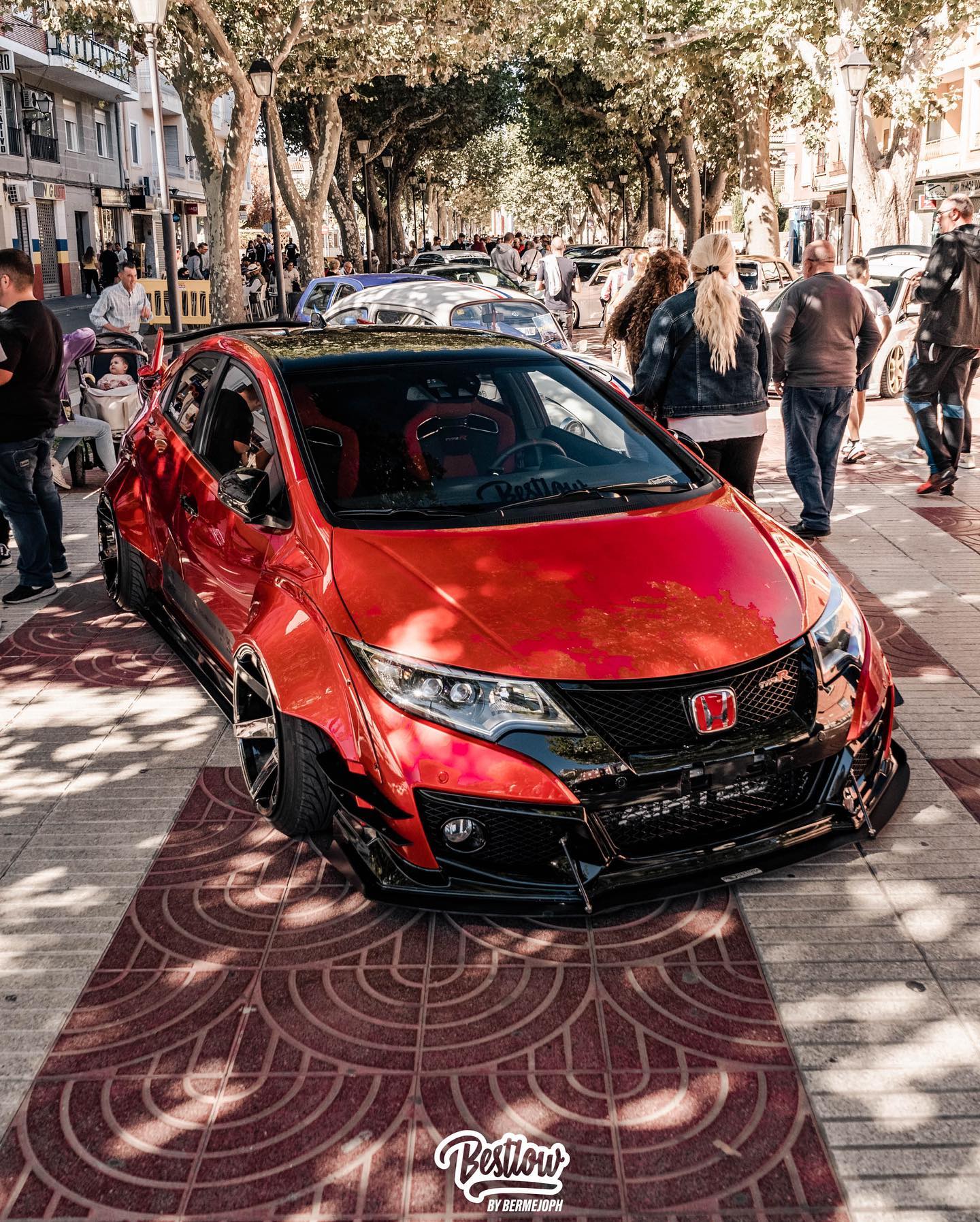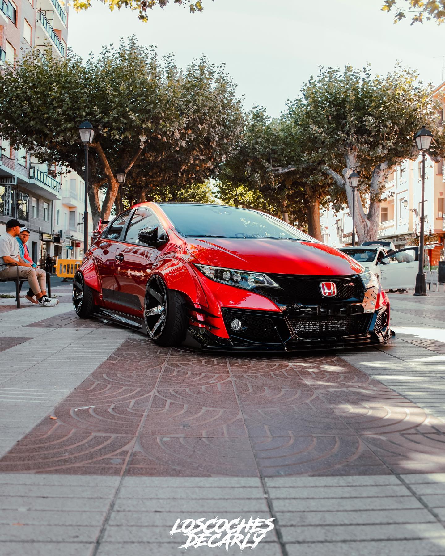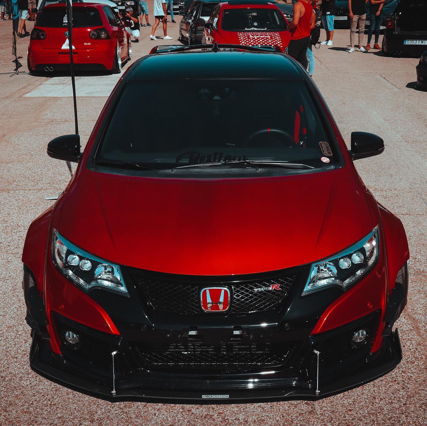 This Honda Civic Type R FK2, modified by Ventura_typeR32, features a striking Rocket Bunny widebody kit with massive flares bolted directly to the body, extending at least 3 inches. The aggressive stance is further enhanced by wider tires and air suspension, while an Airtec intercooler peeks through the front, hinting at performance upgrades. This unique build brings new appreciation to the often-overlooked FK2 generation.