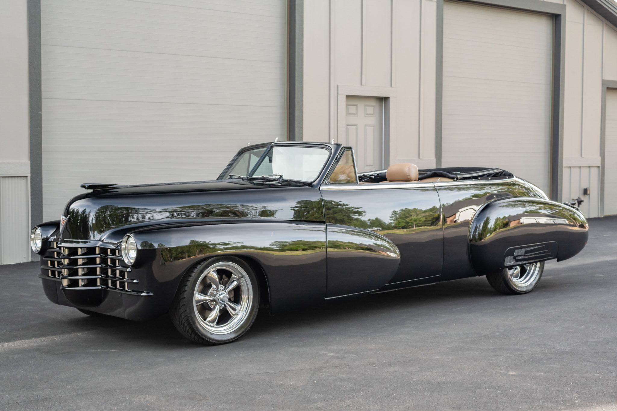 This custom 1947 Cadillac Series 62 Convertible boasts a sleek black exterior with shaved, nosed, and decked bodywork complemented by frenched headlights and a body-color grille. The interior features a luxurious tan and beige upholstery with a burl wood-finished dashboard, a Billet Specialties steering wheel, and modern amenities like Vintage Air climate control. Enhanced with a fuel-injected Chevrolet LT1 V8, American Racing wheels, and four-wheel disc brakes, this convertible is a striking blend of classic style and modern performance.