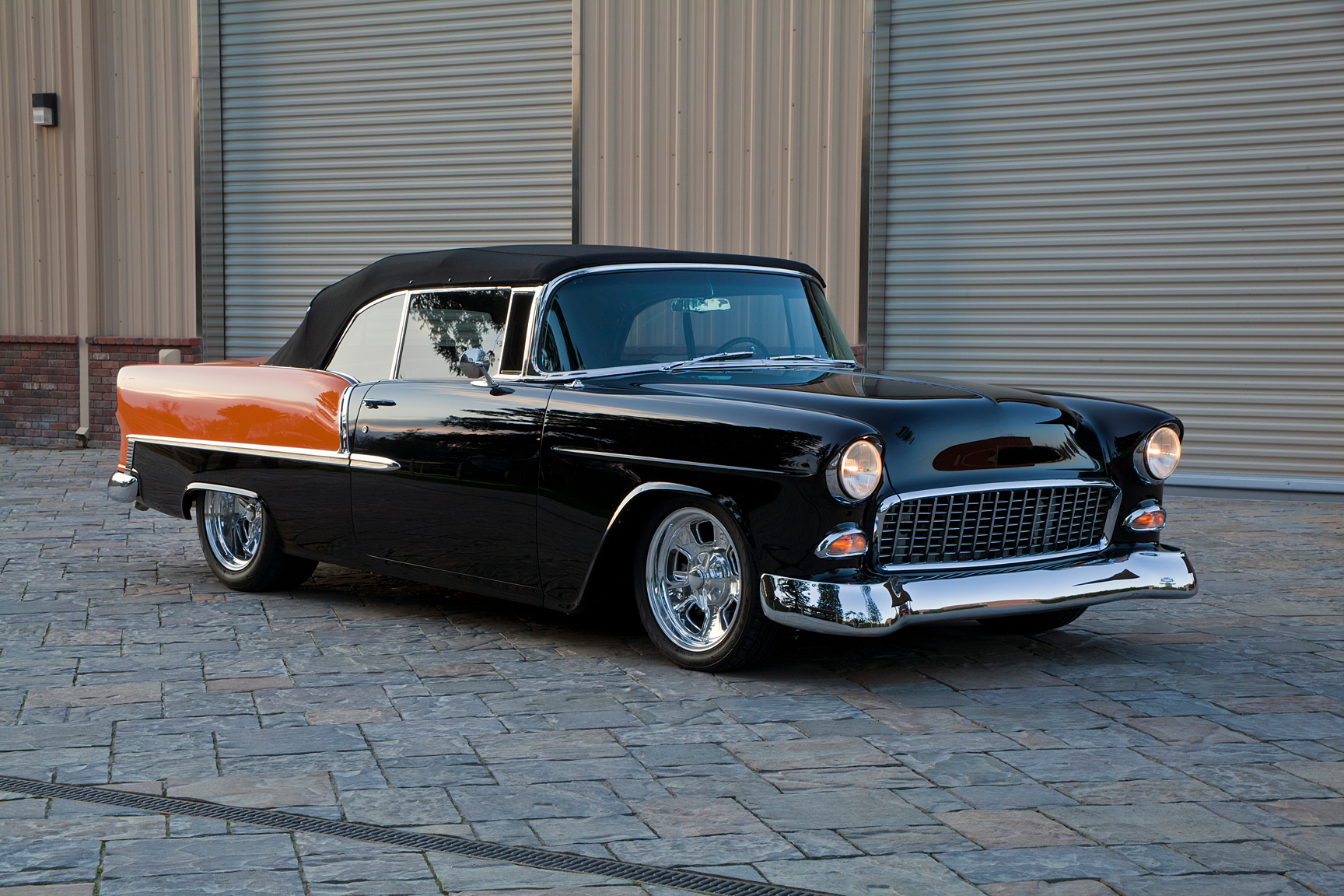 This striking custom 1955 Chevrolet Bel Air Convertible boasts a vivid black and orange two-tone finish expertly applied by Fat Jack Robinson. Featuring a 5.7-liter LS6 V8 connected to a 4L60E automatic transmission, this classic beauty balances nostalgic charm with modern power. The car sits on 17-inch Billet Specialties wheels and sports a refined interior with two-tone leather and Vintage Air climate control.