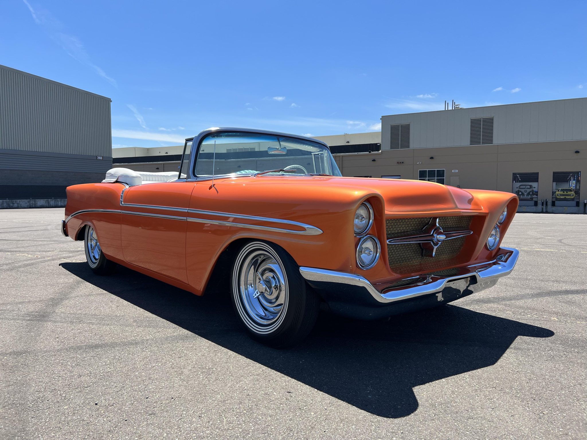 This custom 1956 Chevrolet Bel Air Convertible flaunts a bold orange body with Chrysler-style front lighting and a supercharged V8 engine. The car features unique modifications such as nosed and shaved bodywork, smoothed bumpers, and white upholstery, creating a striking retro hot rod appearance.