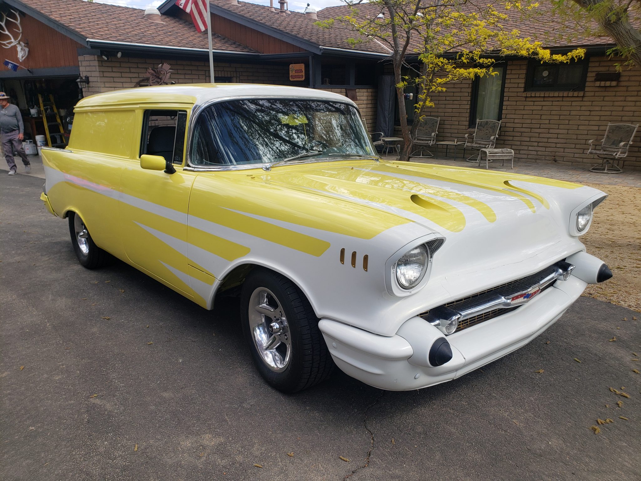 This custom 1957 Chevrolet Bel Air Wagon is transformed into a striking delivery configuration painted in yellow and white. Featuring a rebuilt 327ci V8 engine and unique design elements like a front-hinged one-piece front end and shaved side moldings, this build combines vintage charm with a bold modern flair.