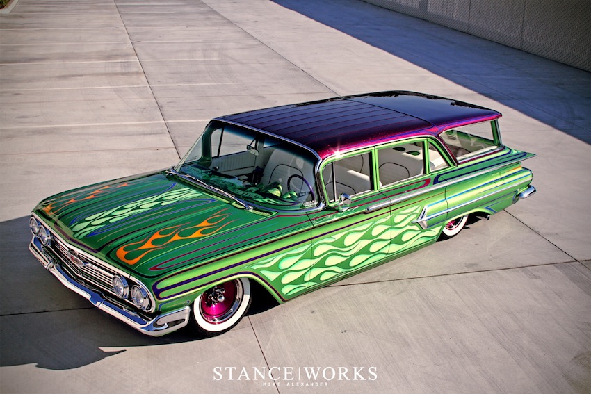 Rob Macdonald’s 1960 Chevy Wagon embodies the bold and colorful style of the Locos Banditos, featuring a striking K-Daddy paint job and a custom-built 409 engine. Its stance is enhanced by a full AccuAir Suspension setup, making it a standout at shows like the Santa Maria Cruisn’ Nationals.
