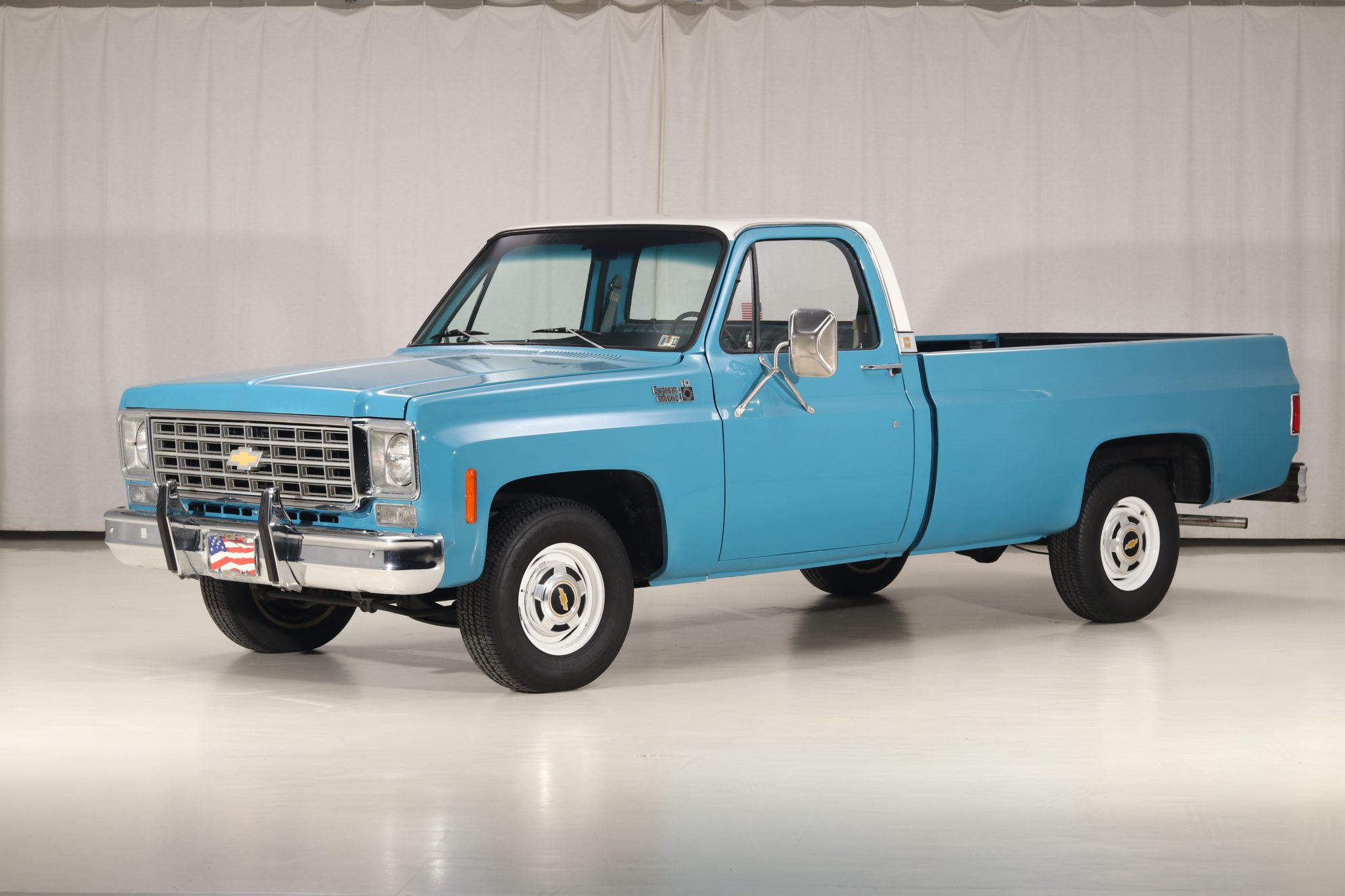 This 1976 Chevrolet C10 Custom Deluxe is a Fleetside pickup finished in blue with a white roof. Power is provided by a 250ci inline-six paired with a three-speed automatic transmission. Notable features include a rear step bumper, Duraliner drop-in bed liner, and power-assisted steering and brakes. The truck rides on 15" steel wheels with factory hubcaps and Dunlop tires. Interior upgrades include black carpeting, a retro-style Bluetooth stereo, and Custom AutoSound speakers. The truck was repainted in 2005, and extensive body replacement work was done at that time. Offered with service records and a Florida title. This 1976 Chevrolet C10 Custom Deluxe is a Fleetside pickup finished in Hawaii Blue with a Frost White roof. It features a 250ci inline-six engine paired with a three-speed automatic transmission. The truck's amenities include a rear step bumper, power-assisted steering and brakes, a heater, and an AM radio. The truck was repainted in 2005 by Nelson’s Auto Repair, with new doors, fenders, cab corners, and bed sides installed. It rides on 15" white-painted steel wheels with factory hubcaps and 235/75 Dunlop SP40 A/S tires. The cabin offers a blue vinyl and cloth bench seat, faux wood trim, and auxiliary gauges.