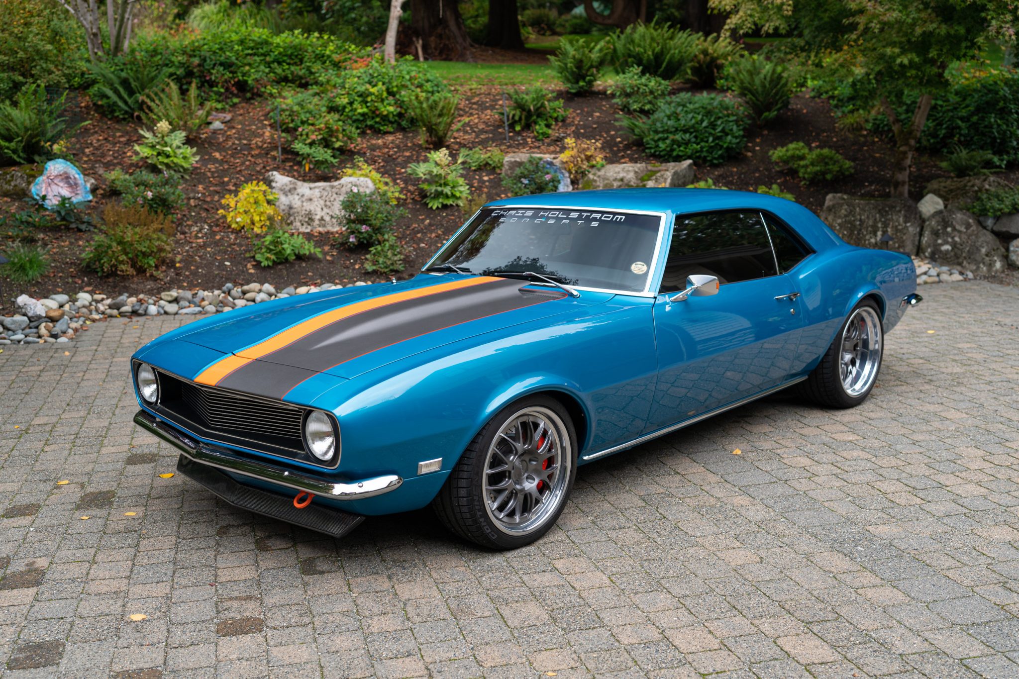 This 1968 Chevrolet Camaro, built by Chris Holstrom Concepts, features a 6.2-liter LS3 V8 with a Holley Terminator EFI induction system. It has a Tremec T56 six-speed manual transmission, carbon-fiber driveshaft, and a 9-inch rear axle with a limited-slip differential. The car showcases a Detroit Speed suspension, JRi coilovers, and Forgeline three-piece wheels. Its exterior includes a metallic blue finish with gray and orange accents, carbon-fiber spoilers, and LED lighting. The interior is trimmed in black leather with Corbeau seats and includes modern features like Vintage Air climate control and a Bluetooth-compatible stereo. Debuted at the 2017 SEMA Show, it comes with accompanying build receipts.