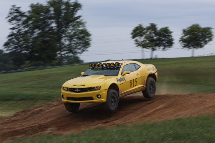Kyler Millershaski transformed his previously stock 2013 Camaro SS to compete in the HooptieX competition at Holley LS Fest East. The car underwent modifications including LiftaBrand extended front struts, 32-inch-tall tires, and a light bar. Despite only having a couple of inches of travel making the ride rough, the Camaro handled the dirt course with roostertails through corners.