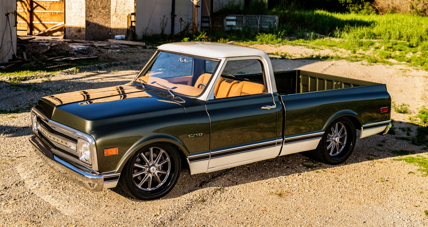This custom 1969 Chevrolet C10 pickup features a body-off restoration with a sleek green DB series PPG paint paired with a white cab top. Equipped with a powerful LS1 V8 engine and lowered suspension, it also sports stylish 20" US Mags and a custom TMI Products interior, making for an eye-catching and performance-oriented classic truck.