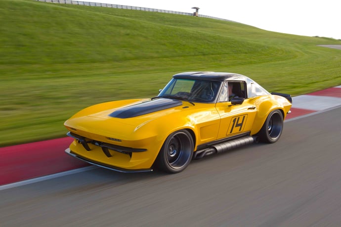 The 'Solar Flare' is a 1963 Corvette built by Bob Bertelsen, featuring a 427 cubic inch LS swap producing 660 horsepower. Sporting a distinctive widebody look with carbon fiber components, including a custom Targa roof, it’s equipped with Detroit Speed suspension and Baer Brakes. Built for autocross, the car combines aggressive aesthetics with high performance.