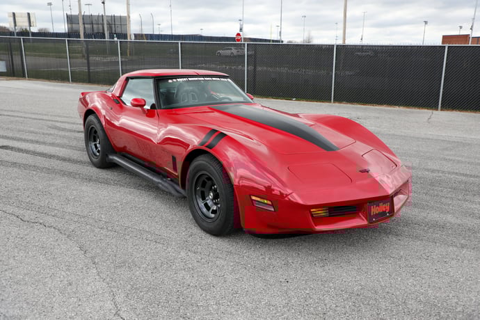 This 1982 Chevrolet Corvette, built by Brenton Thiessen, features a rebuilt 350ci small-block engine. It has been outfitted with Holley EFI components, including a throttle body and a digital dash, and includes a NOS Big Shot nitrous system for an extra 150 horsepower boost. The car is finished in a striking red, inspired by Prince's 'Little Red Corvette'. Other modifications include Rekudo brakes, a Muncie four-speed manual transmission, and sidepipes. Originally a restoration project, it has evolved into a reliable 13-second quarter-mile performer with planned future upgrades.