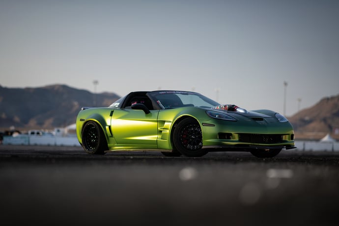 This C6 Corvette, built by Tim Wallin of Whiskey Throttle Racing, is a formidable machine designed for drifting and burnout contests. Winning the burnout contest at LS Fest West 2022, the car features a powerful 427ci LSX engine producing 598hp at the rear wheels. It is equipped with Mast Motorsports' Black Label cylinder heads, a Texas Speed camshaft, and runs a Holley Terminator X Max ECU. The drivetrain includes a six-speed manual gearbox with upgraded internals, while suspension upgrades from Part Shop Max enhance handling. A ZR1-style widebody kit gives it an aggressive stance.